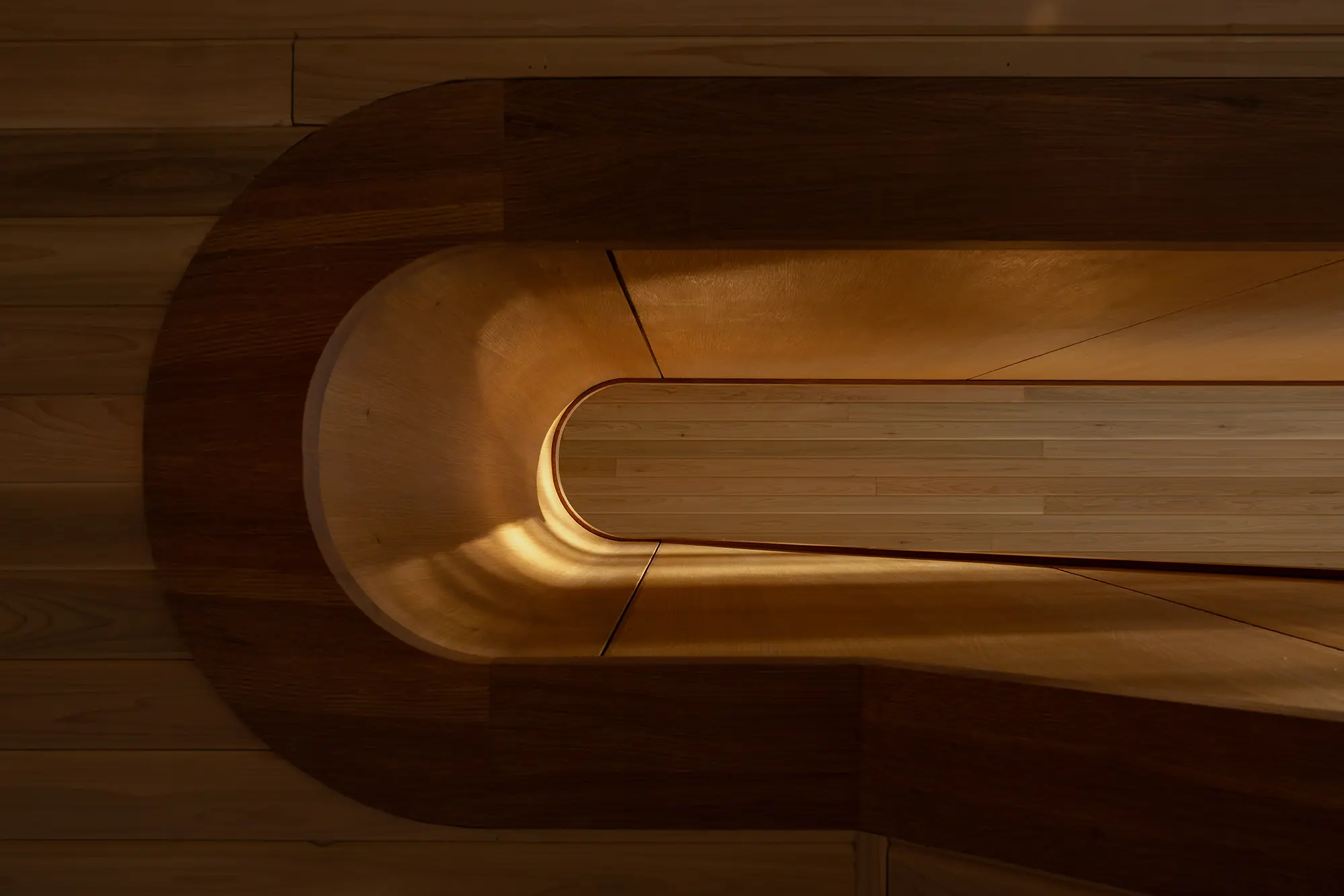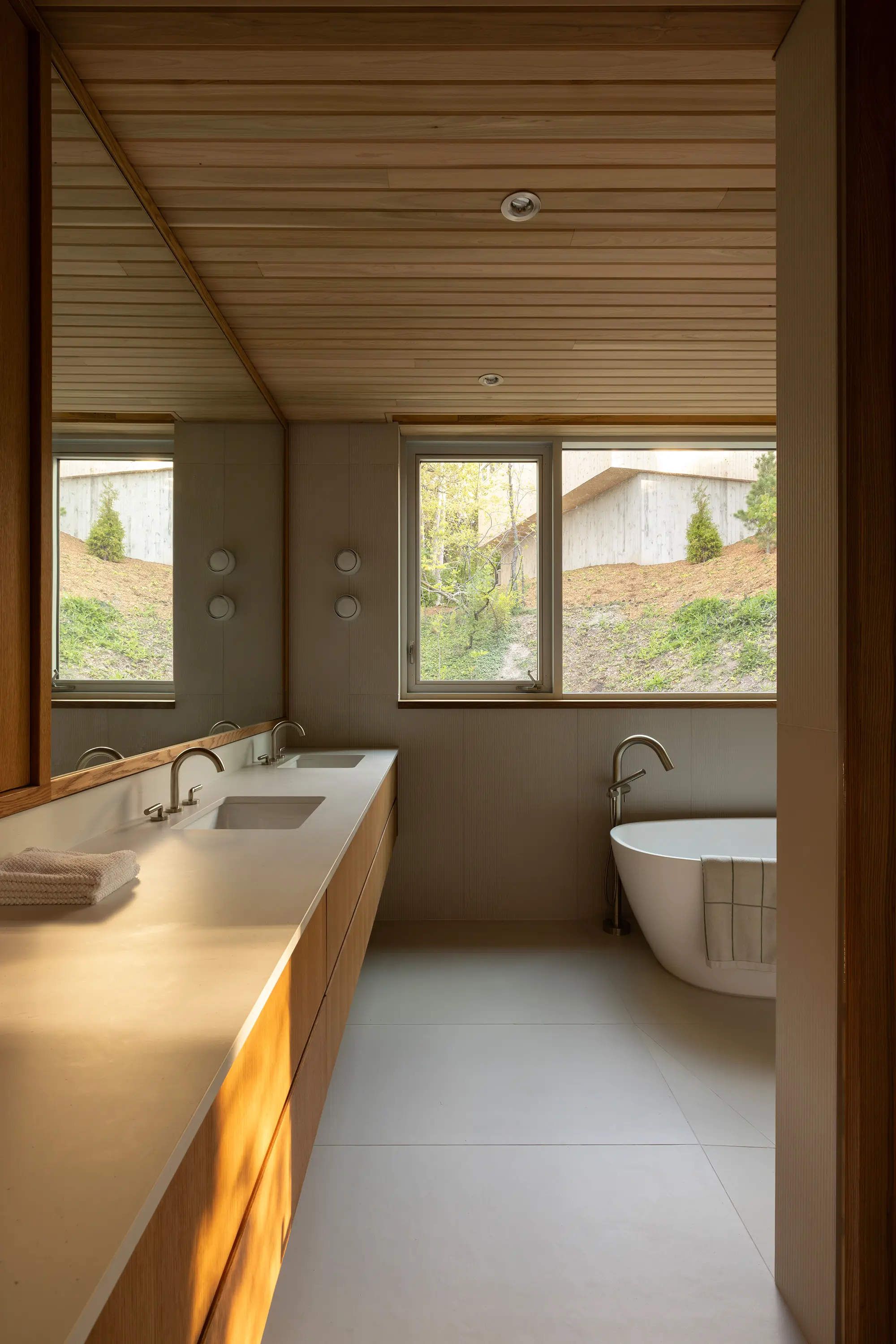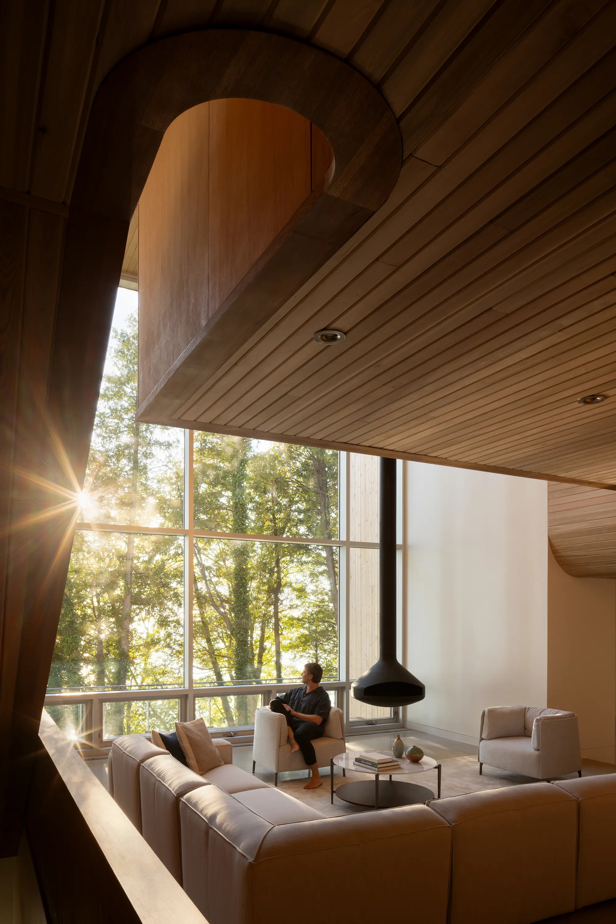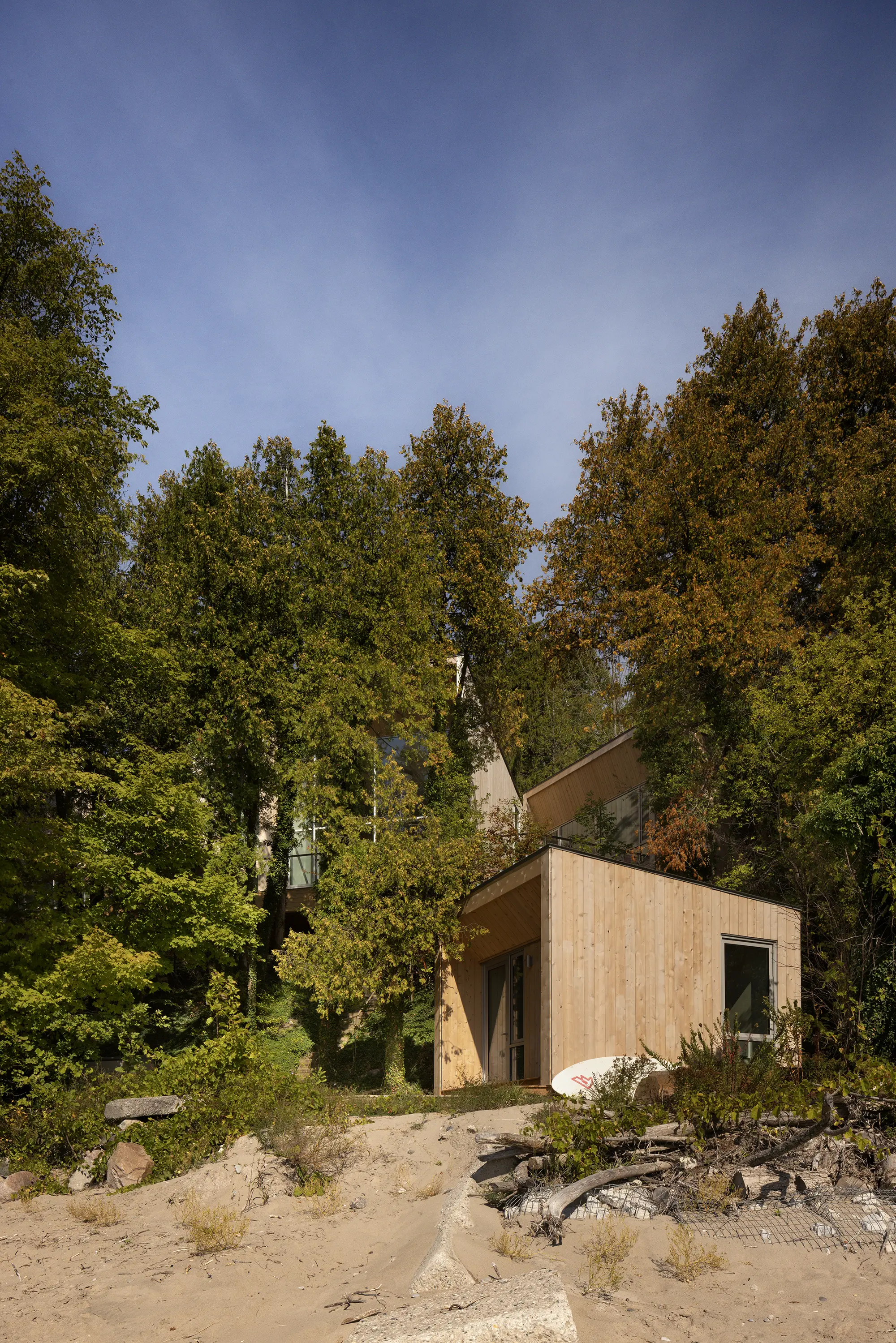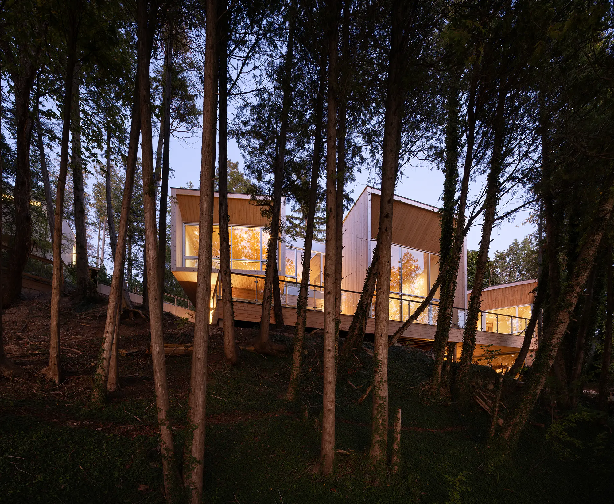 Each program volume rotates to align with existing openings in the tree canopy, framing sweeping views of Lake Huron. Gentle shifts and variations establish a rhythm along the slope, with each interior space forming a unique relationship with the surrounding forest. Large openings capture light and direct attention outward, offering filtered glimpses through branches as well as broader panoramas over the water. The form is precise and playful, a composition that adapts to the terrain and strengthens connections between inside and out.
