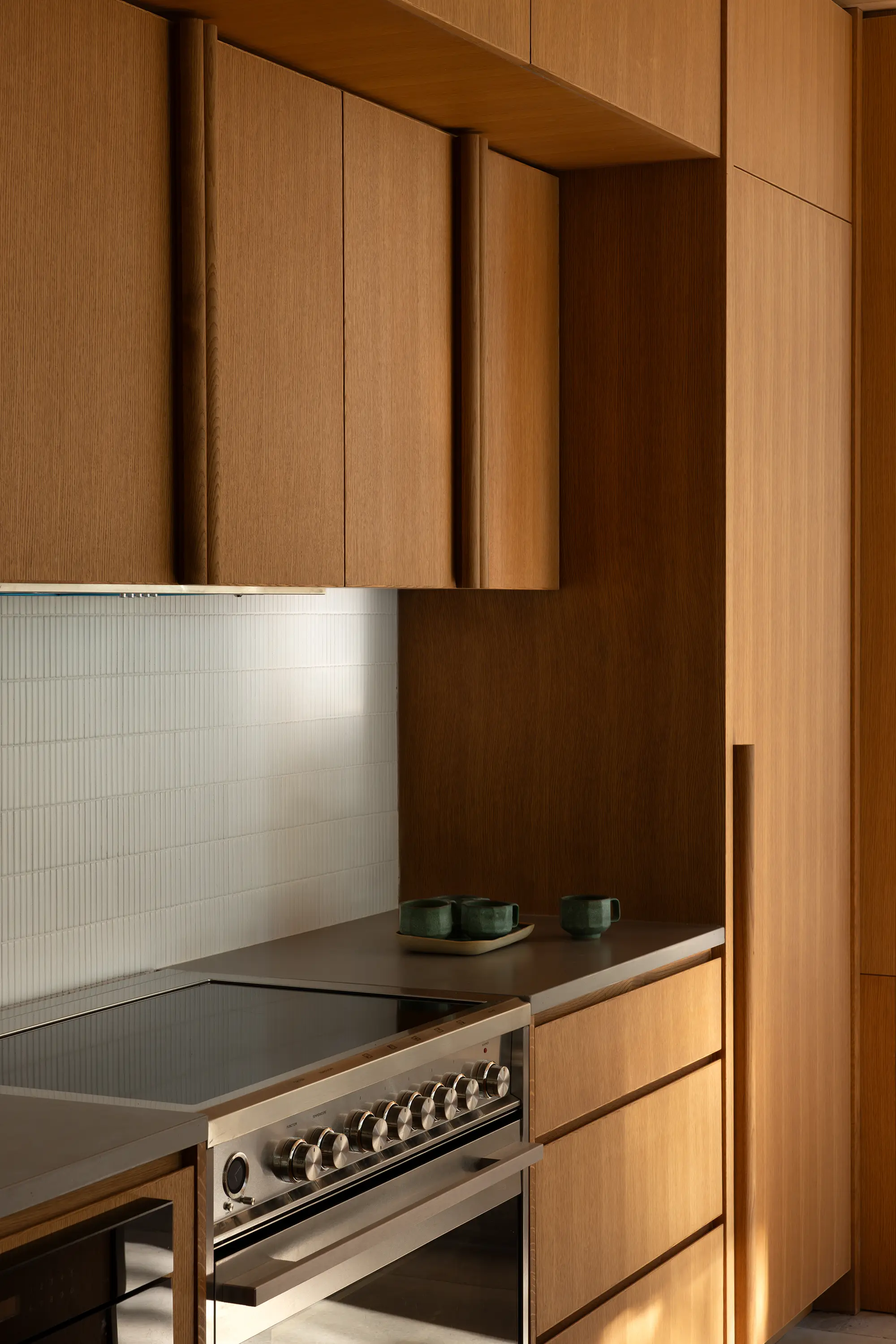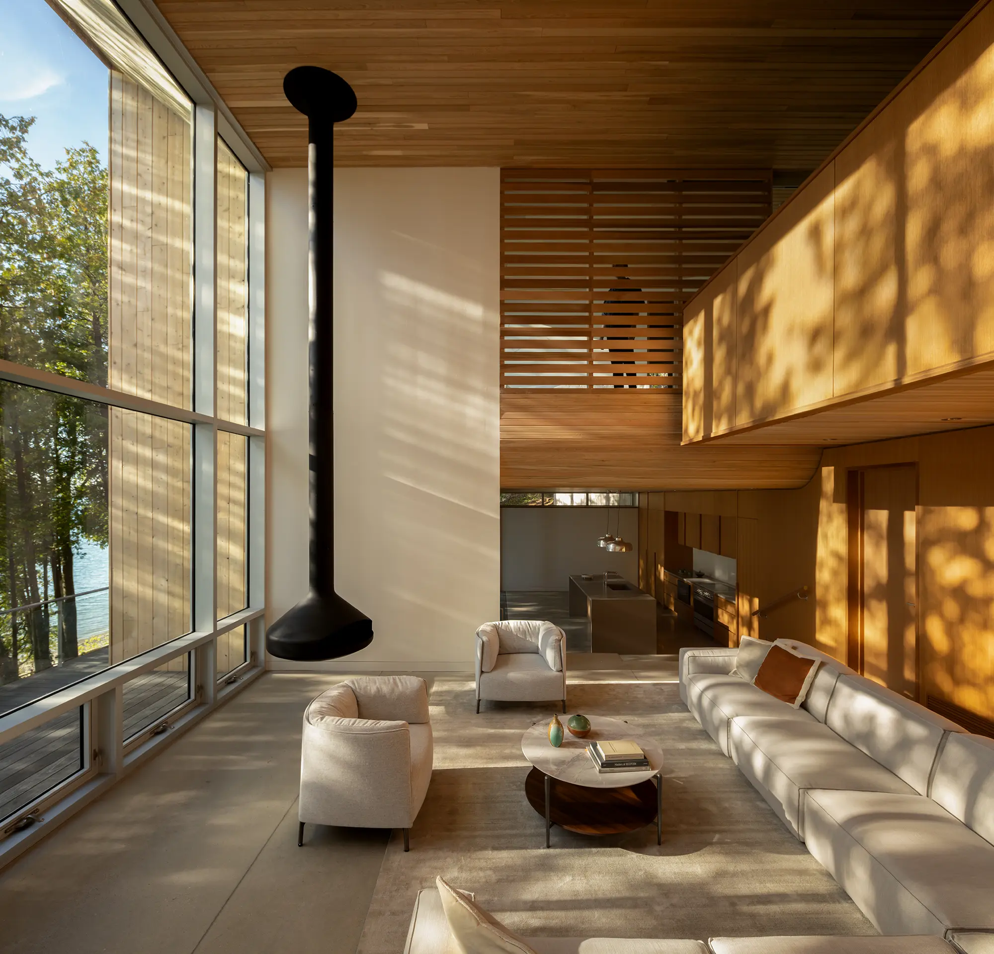 Material choices reinforce a calm and cohesive character. Eastern white cedar clads the exterior, with cedar soffit boards extending through to the interior ceilings. Interior spaces are anchored by banks of oak millwork and soft furnishings, providing warmth and continuity throughout.
