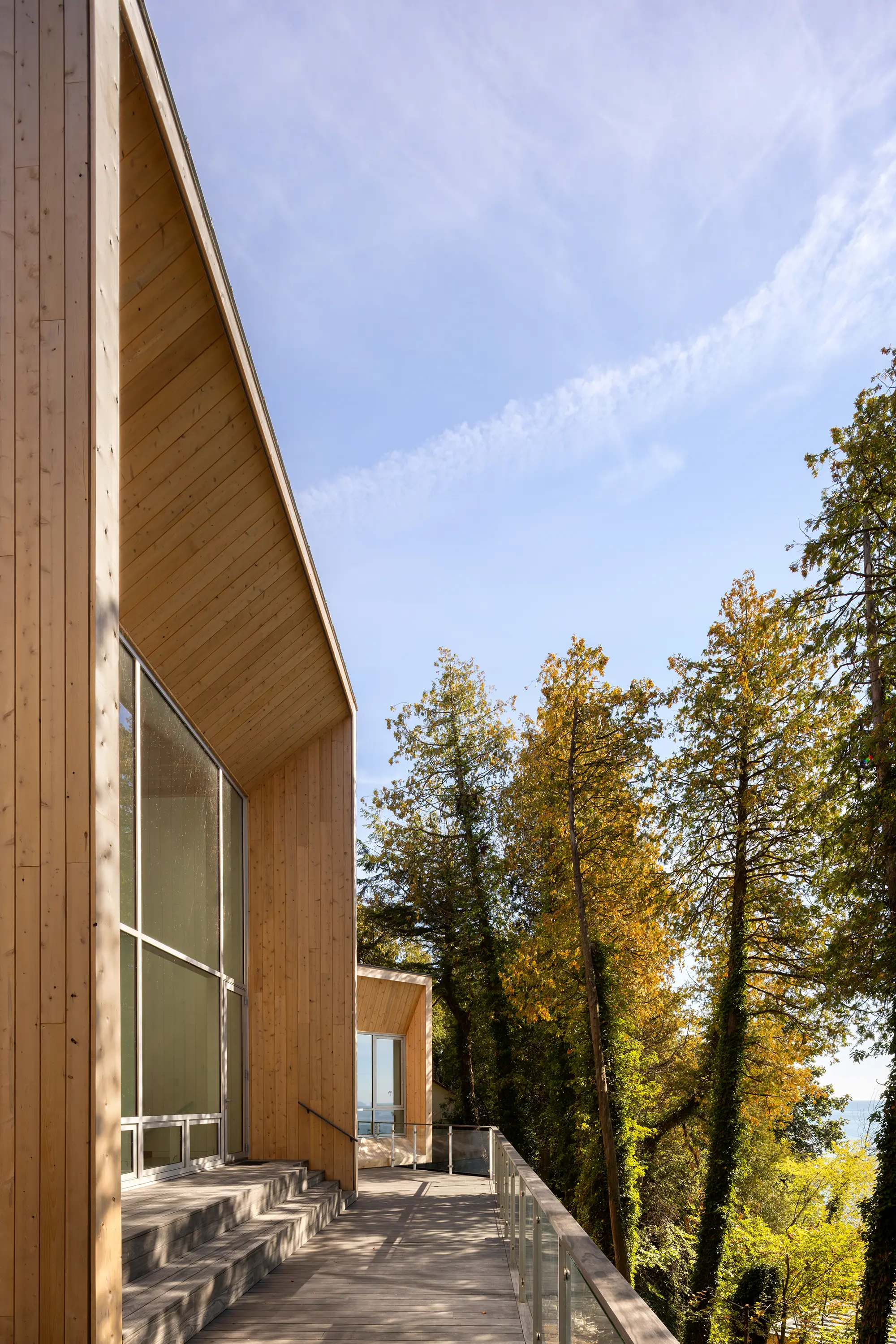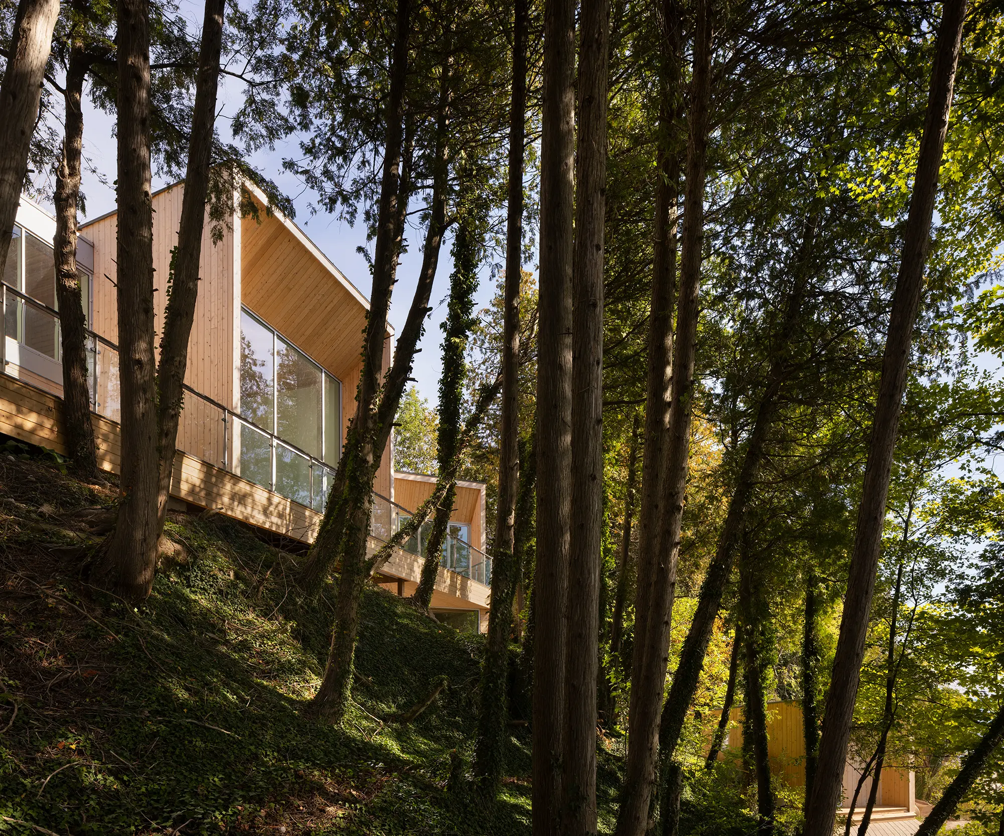 Environmental sensitivity guided initial design decisions, with attention to the preservation of existing trees and to erosion-reduction strategies. Local conservation authorities were engaged early in the process to inform siting and ensure built interventions work with the slope, rather than impose upon it.