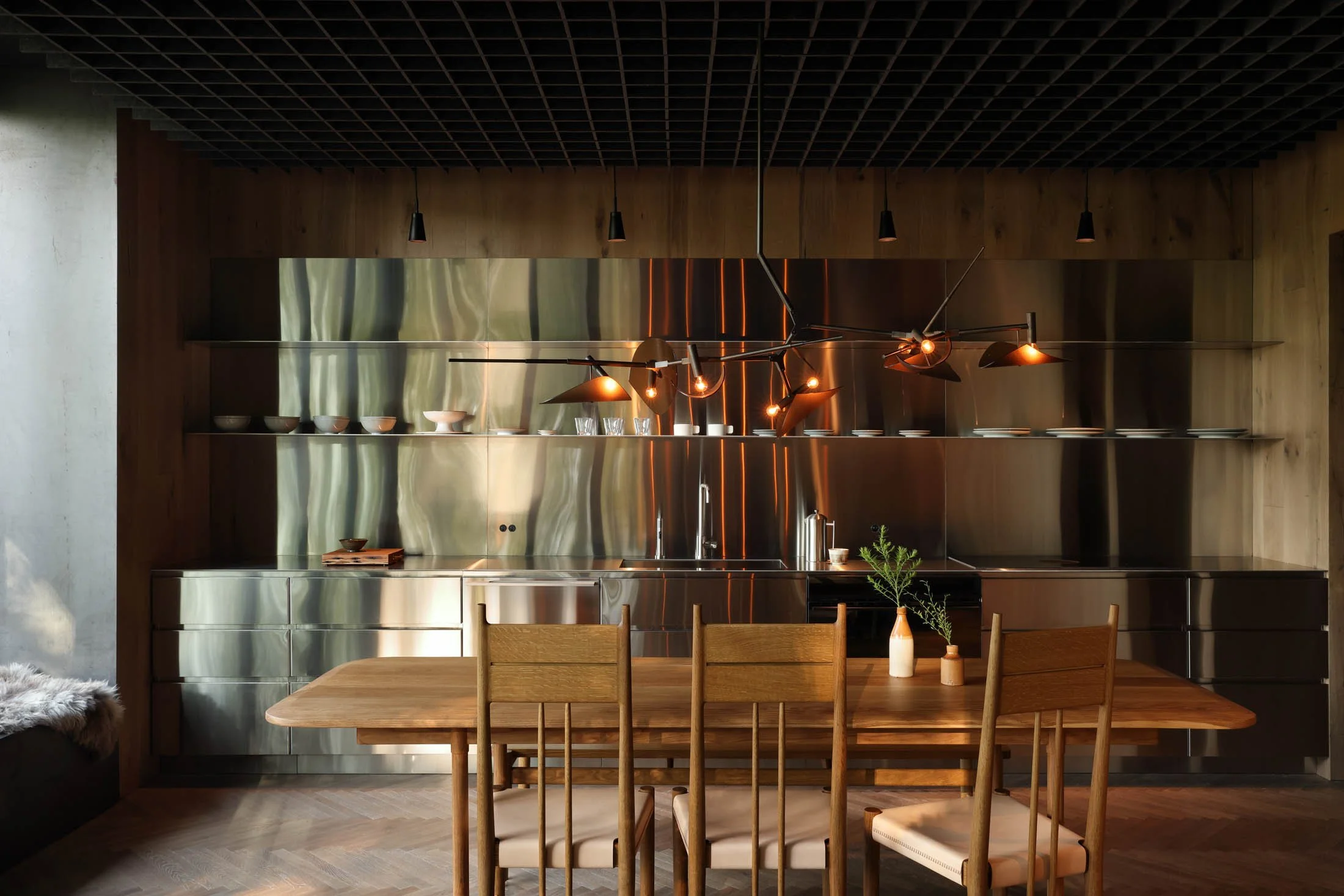 The Alder chandelier utilizes varying diameters of steel tubing to create a branching frame. Slumped glass diffusers and a sandcasted canopy juxtapose the linear forms to create a balanced composition.