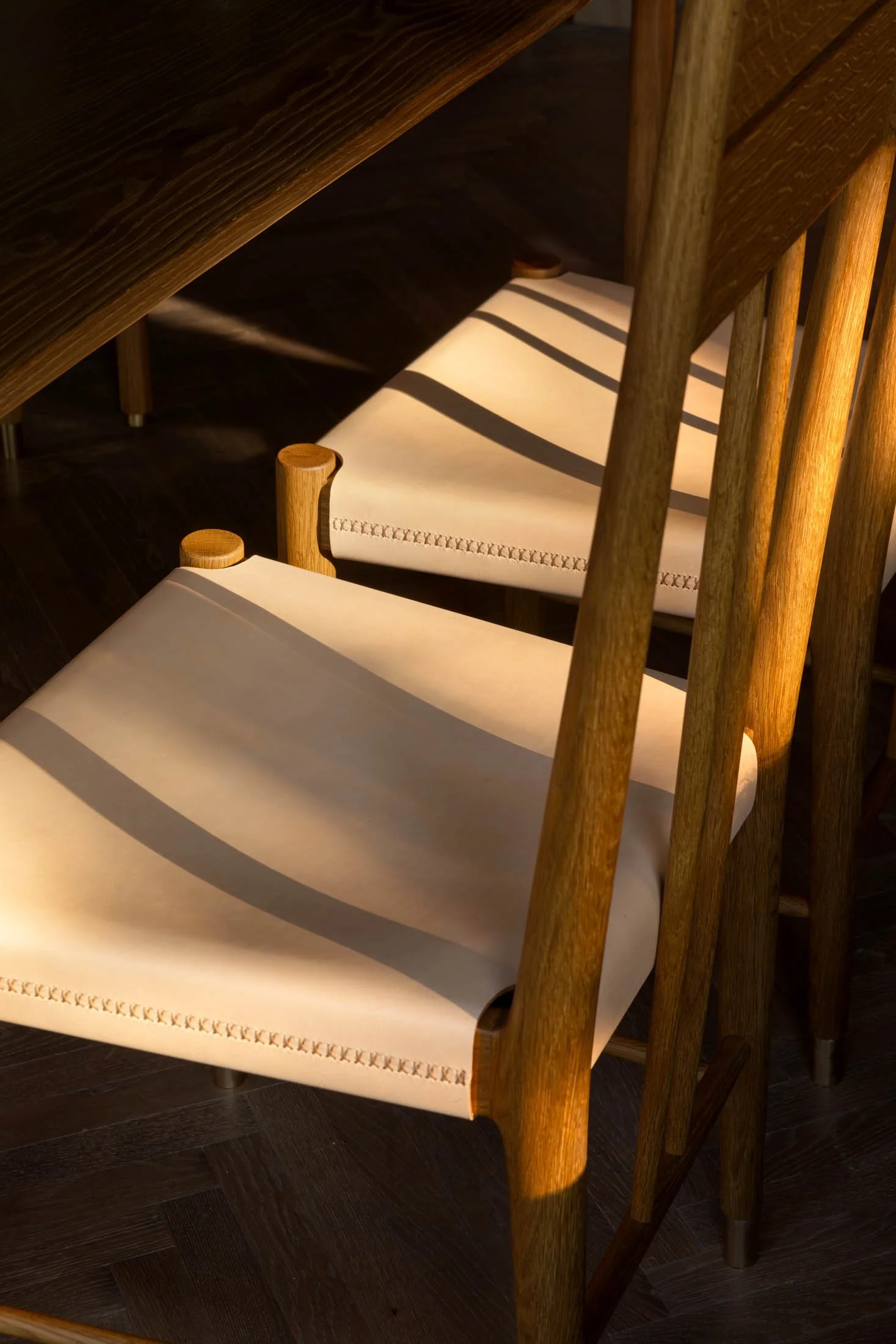 With long outstretched Mannerist proportions, the furniture has a unique, dramatic and timeless character. Brass feet gently touch the floor that it sits on giving the furniture a lightness. Both the chairs and bench are composed of white oak and delicately stitched leather.