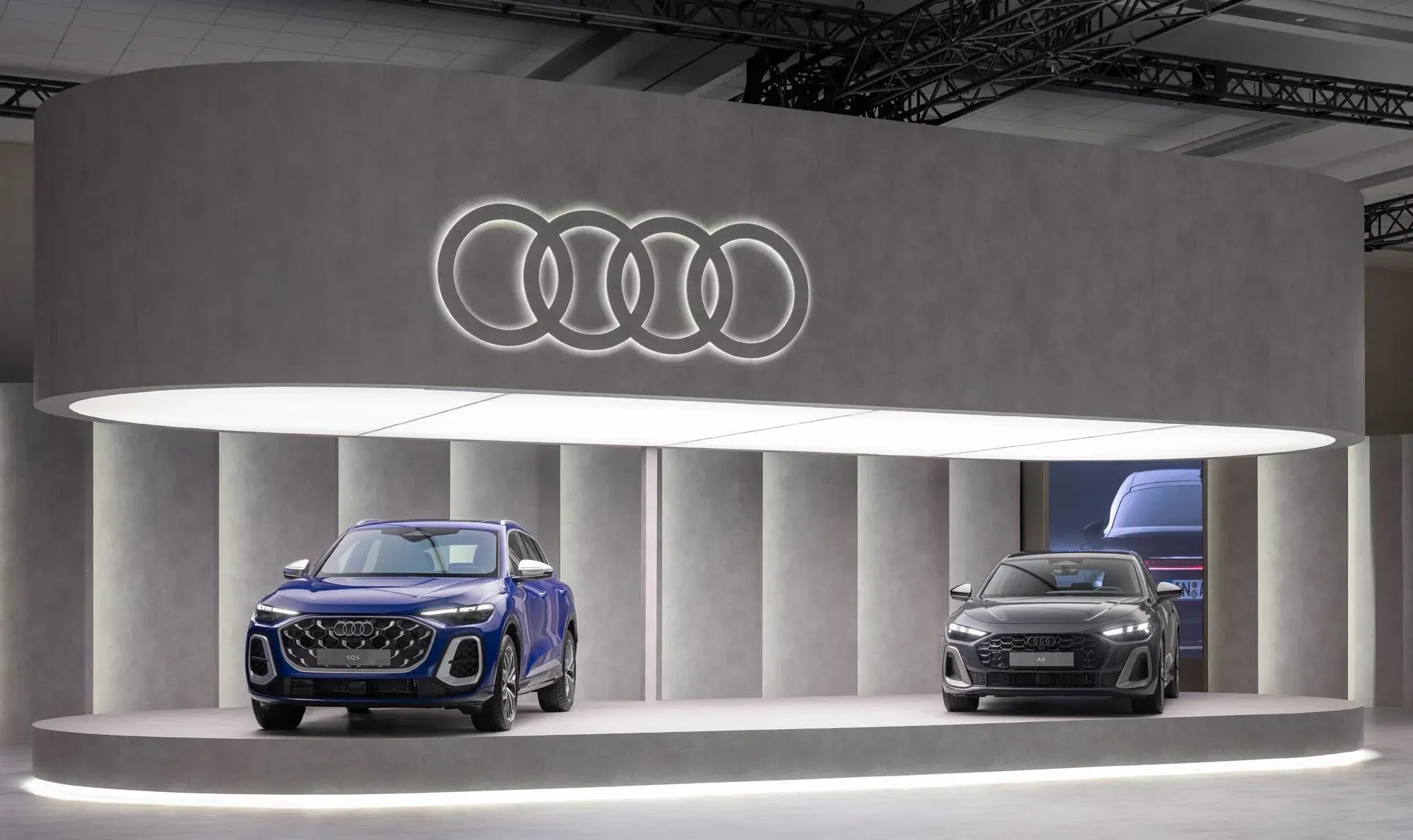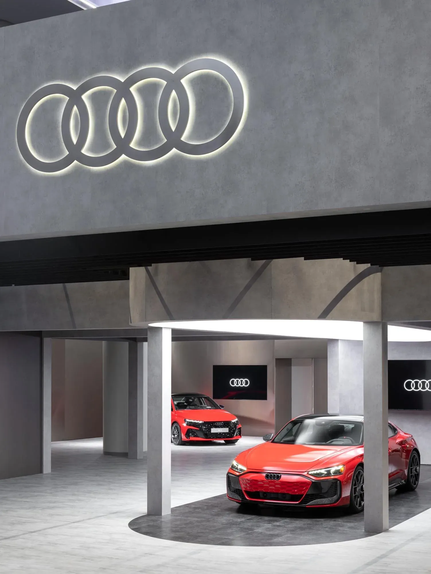 A space crafted with materials that evoke strength and modernity - such as concrete textures, reflective metal surfaces, high-gloss flooring, and dynamic lighting - this immersive environment draws you into a unique sensory experience. The design, inspired by Brutalism, pays homage to Audi’s German architectural heritage, reminiscent of iconic structures like Berlin’s Mausbunker.