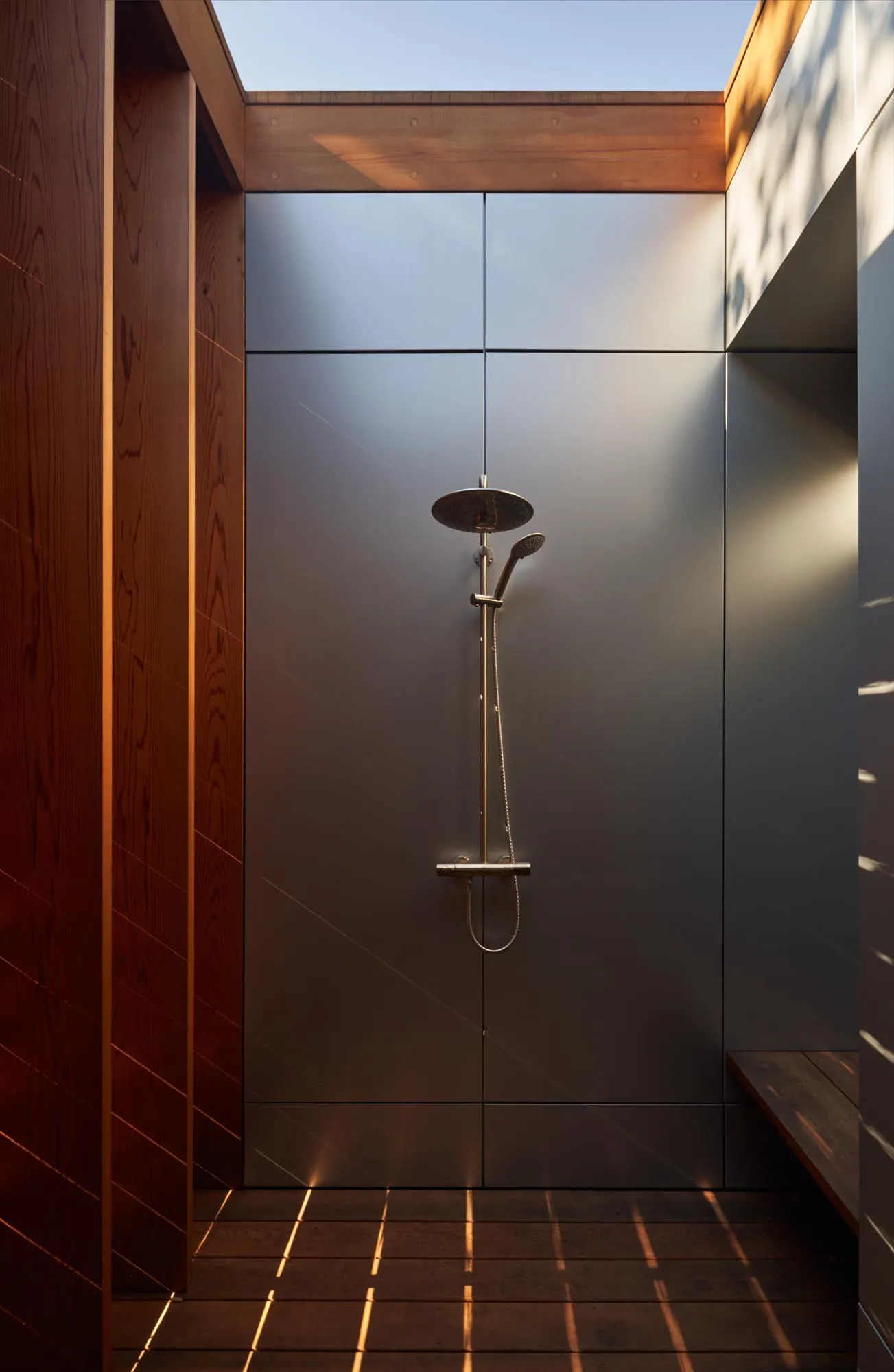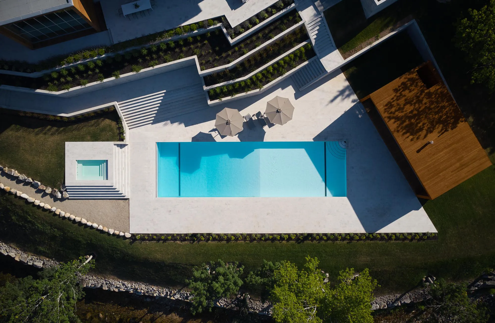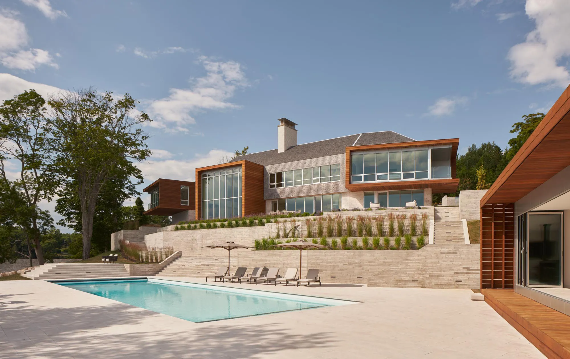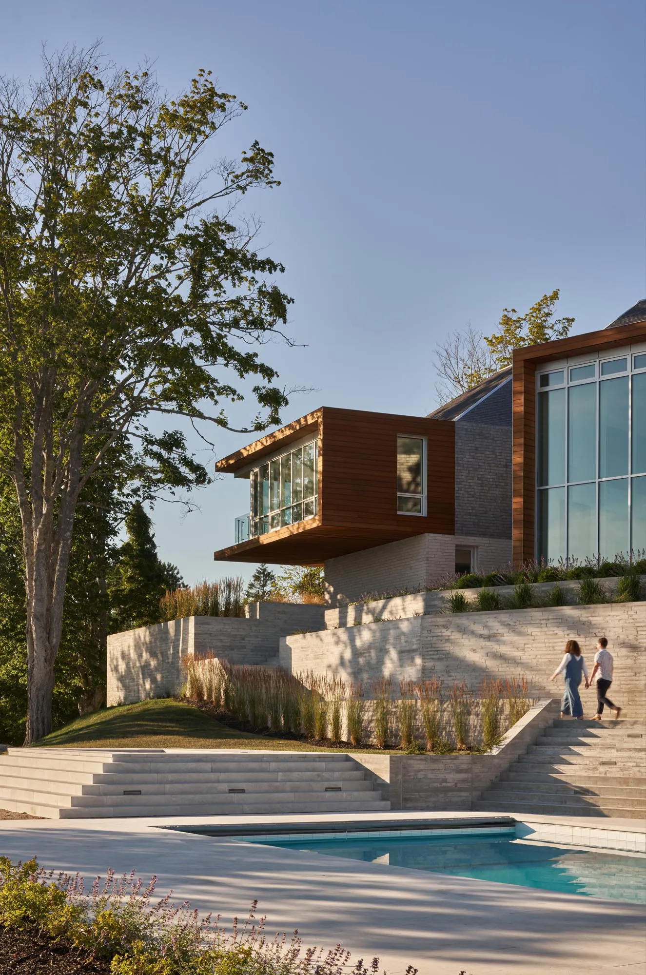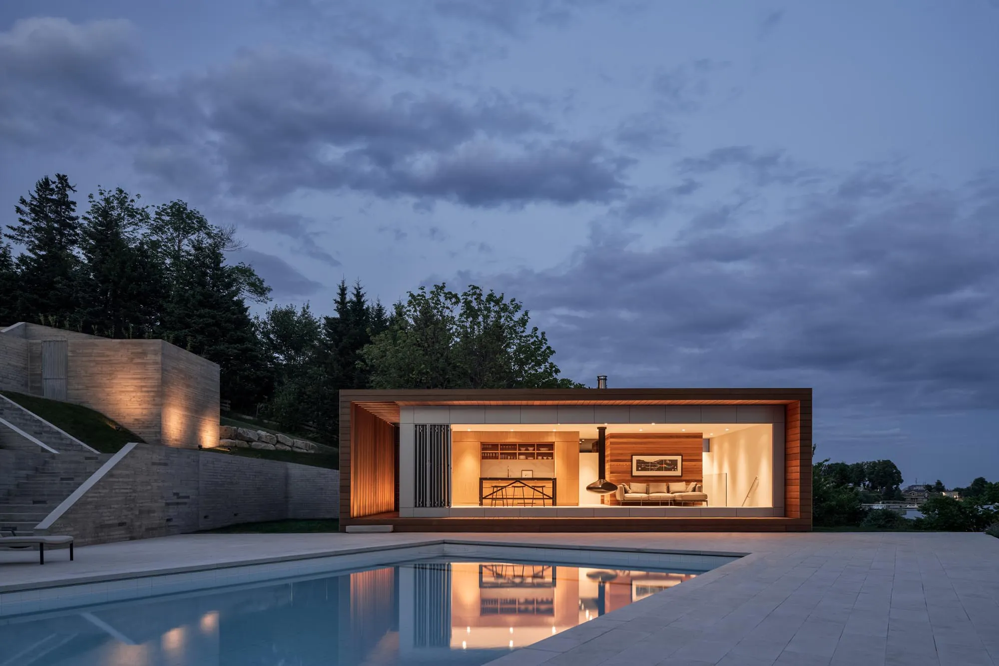 The landscape and topography of the site became a major design opportunity. A series of board form walls create a terraced series of pathways that lead down to a pool, built-in hot tub, and accompanying pool house. The pool house includes a sauna and wood-burning fireplace, offering unique opportunities for play in any season. An expansive wall of windows slides open, further connecting viewers to the ocean scenery.