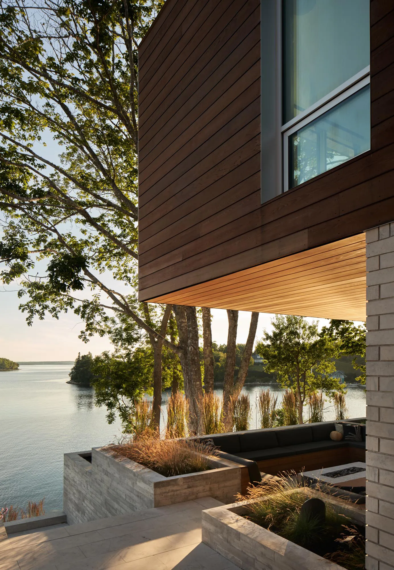 Walking along the lower terrace, you can access the water from an existing boathouse and dock. Days are spent here experiencing the sea, recreational spaces, and the natural environment. The upper terrace connects to the main living quarters and is designed for relaxing and entertaining in the evenings. The dining and lounging section includes a barbecue and cozy fireplace sheltered by one of several cantilevered structures.