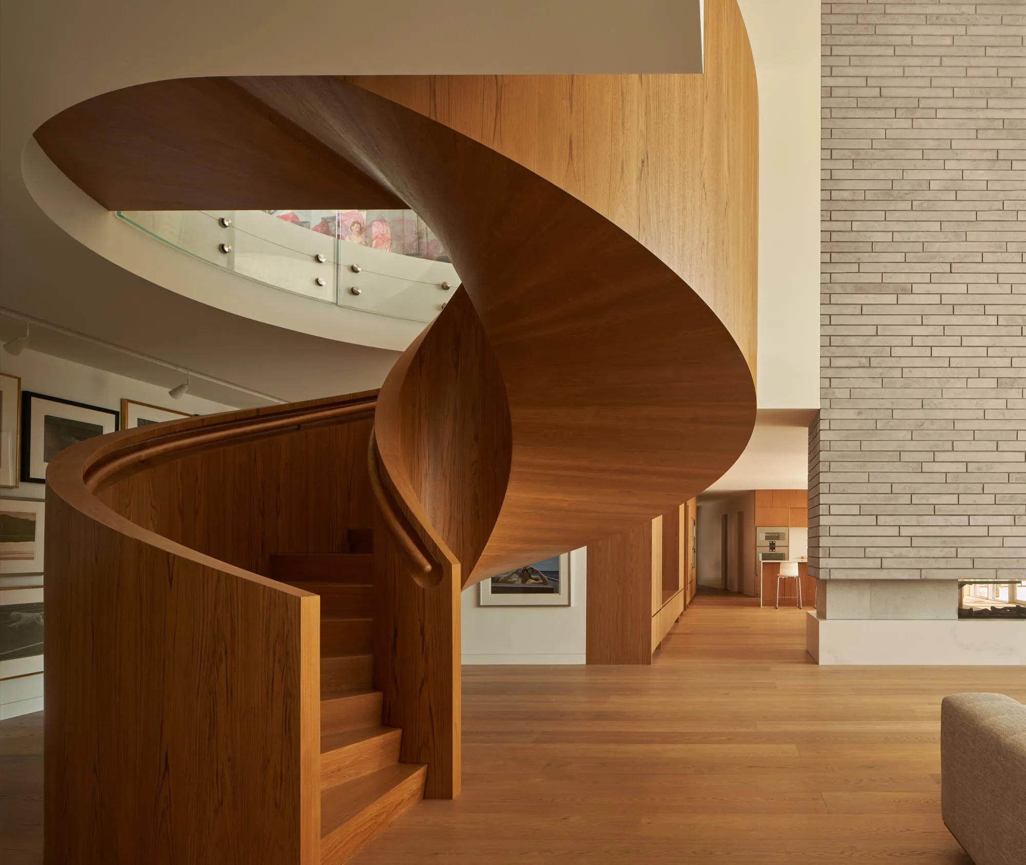 The scale of the house responds to the modest intimacy of the street on the entry side while extending its reach with an expanse of glass and drama on the private seaside. A spiral staircase creates a focal point for the interior space, connecting the entry to the living area and beyond. This staircase is composed entirely of solid wood and was manufactured using 5-axis machining techniques.