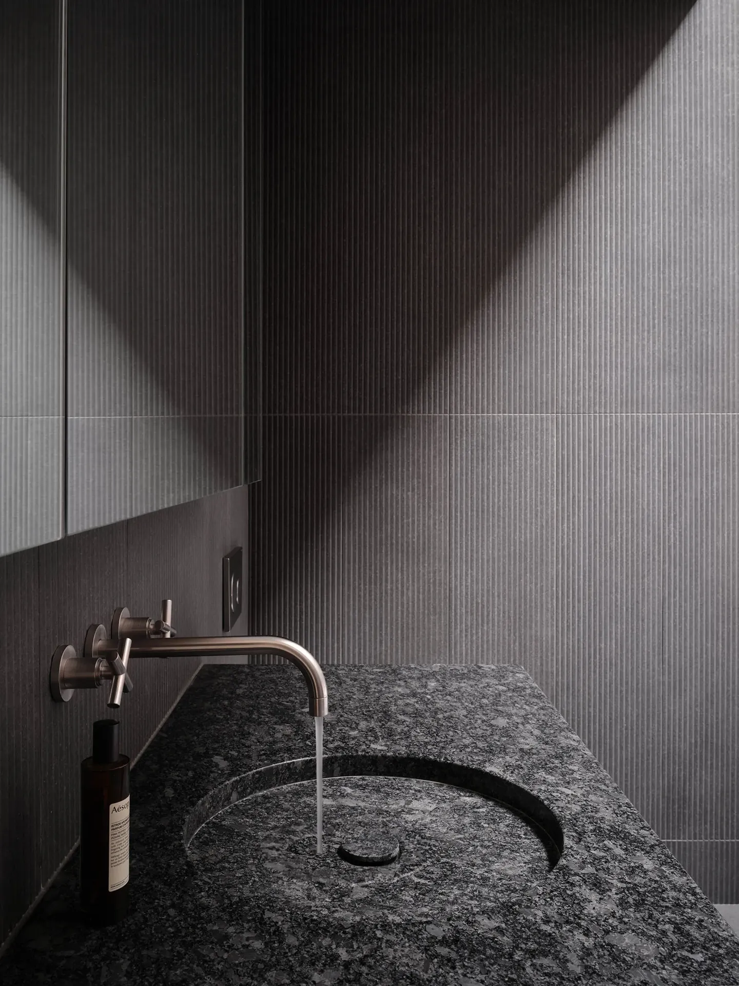 The primary entry for both the studio and house is situated at the rear of the property through a brick courtyard and down a full-width brick stairwell. A large, raw, steel-clad, pill-shaped closet both marks the entry and provides privacy for the studio space. At the top of the first run of stairs is a brick and wood-lined powder room made secure with a 9-foot tall, raw steel pivot door. A custom sink carved from a white oak block hangs from the wall. The second floor, clad entirely in white oak paneling, houses the kitchen, dining and living room spaces. Carved into the end of the volume is a two-storey lightwell which reached the full height of the house. Intensive lighting studies and parametric modelling were used to form find the lightwell shape to ensure optimal natural lighting conditions throughout the length of the living space.