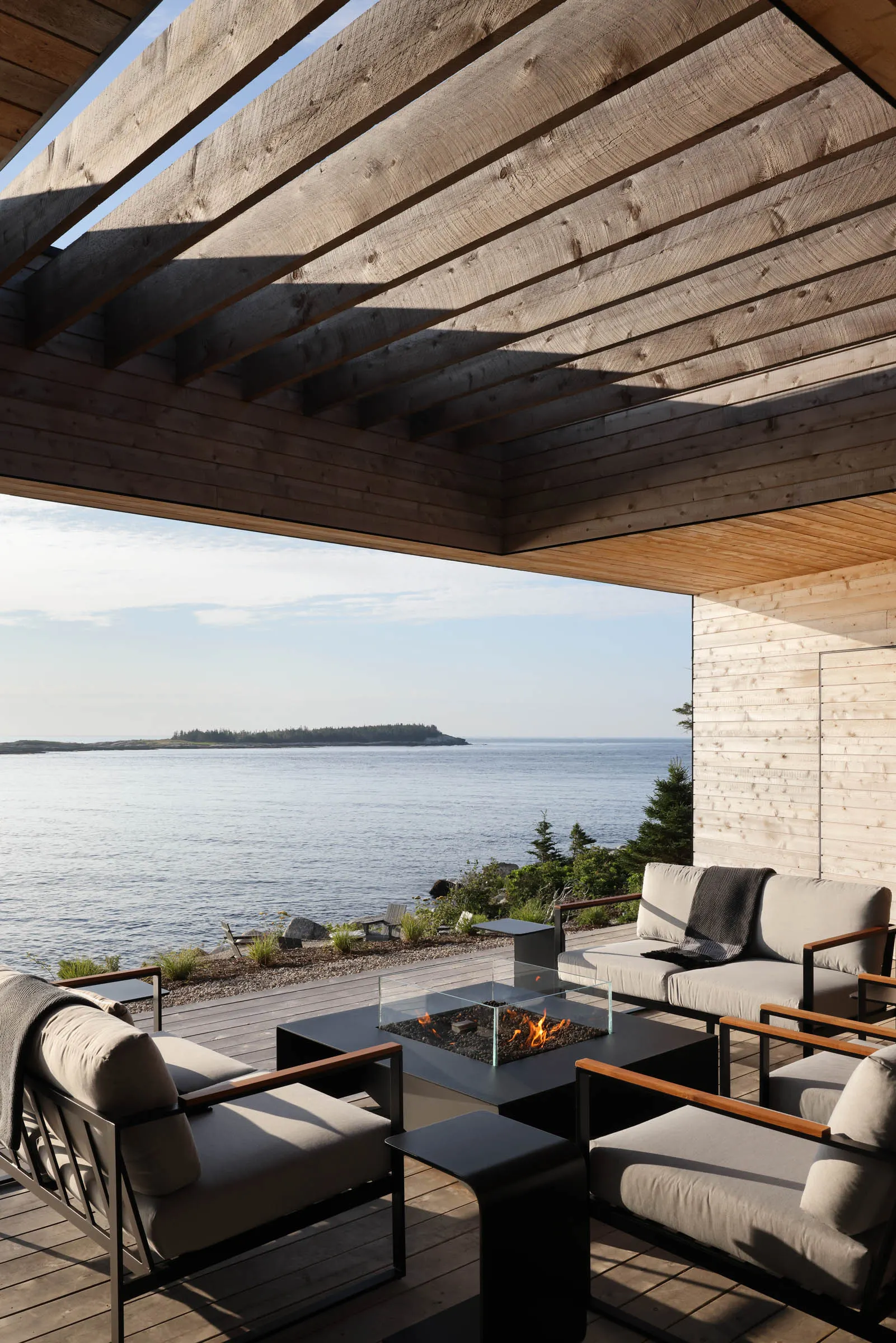Large, covered decks at Rockbound blur the boundaries between indoors and outdoors, drawing the crashing waves and the essence of nature into the living spaces while offering shelter from the sun and changing weather conditions. The bedroom volume, seemingly hovering above the main living spaces, provides a quiet and private sanctuary that feels entirely immersed in the landscape.