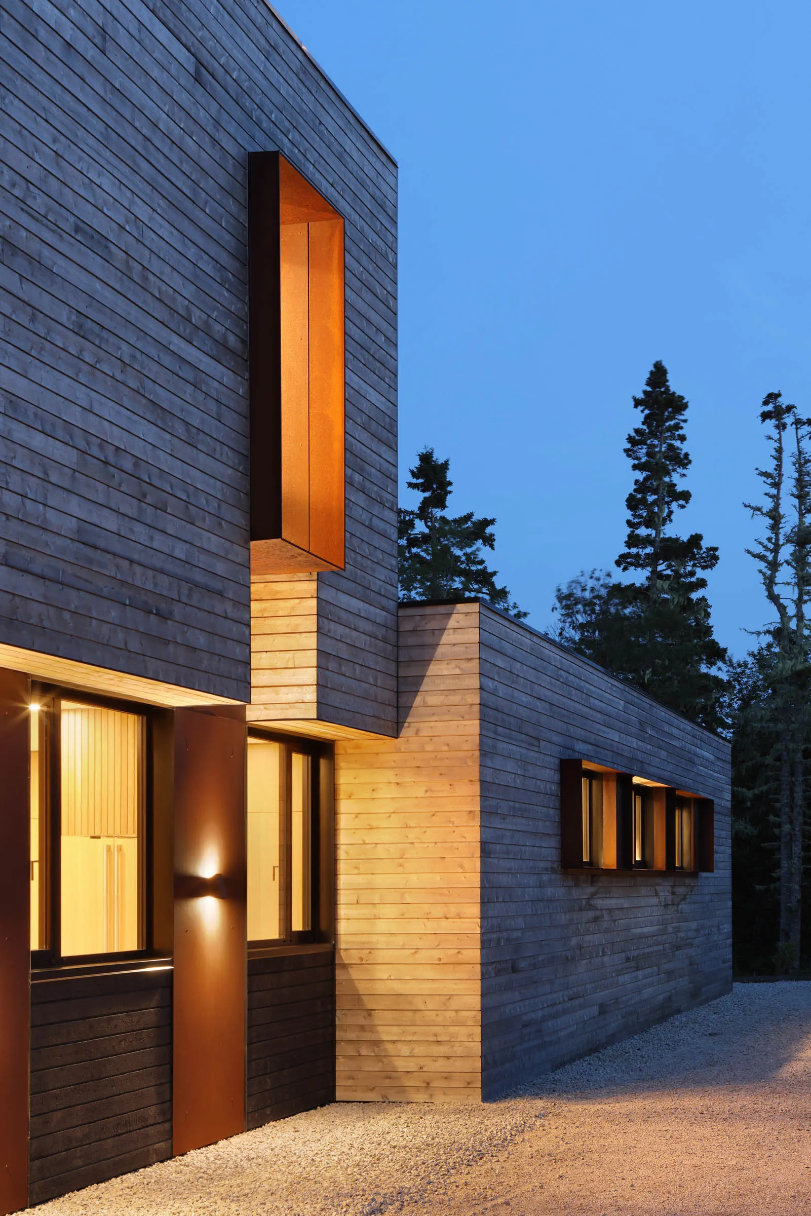 Rockbound's realization was the result of a harmonious collaboration between a strong team of builders and consultants. Each member contributed expertise and material knowledge, pushing the boundaries of design. From steel hoops framing windows for visual interest and climatic control to hidden garage doors and meticulously coordinated cladding, the team achieved seamless coursing lines that beautifully traced the building's volumes.