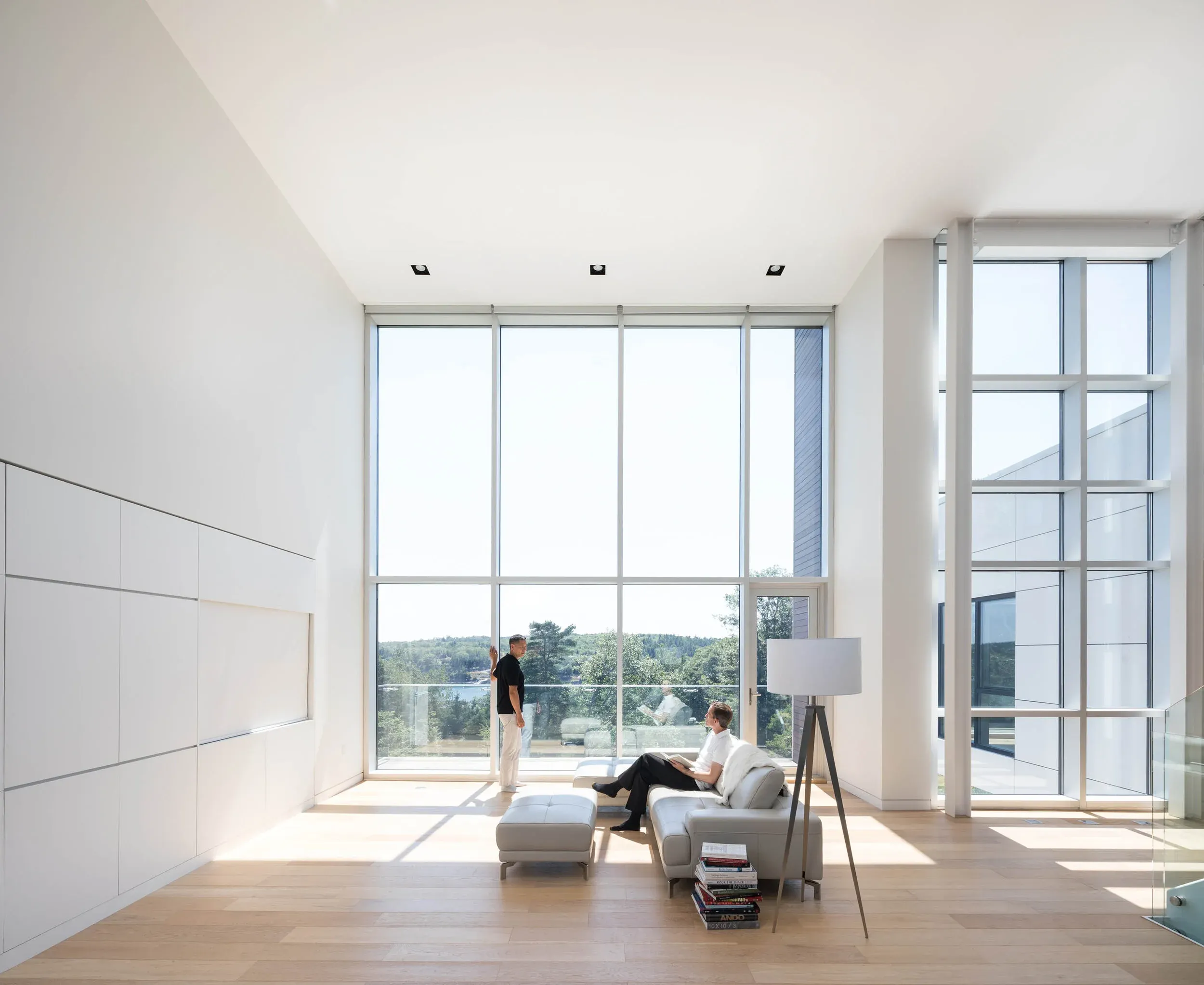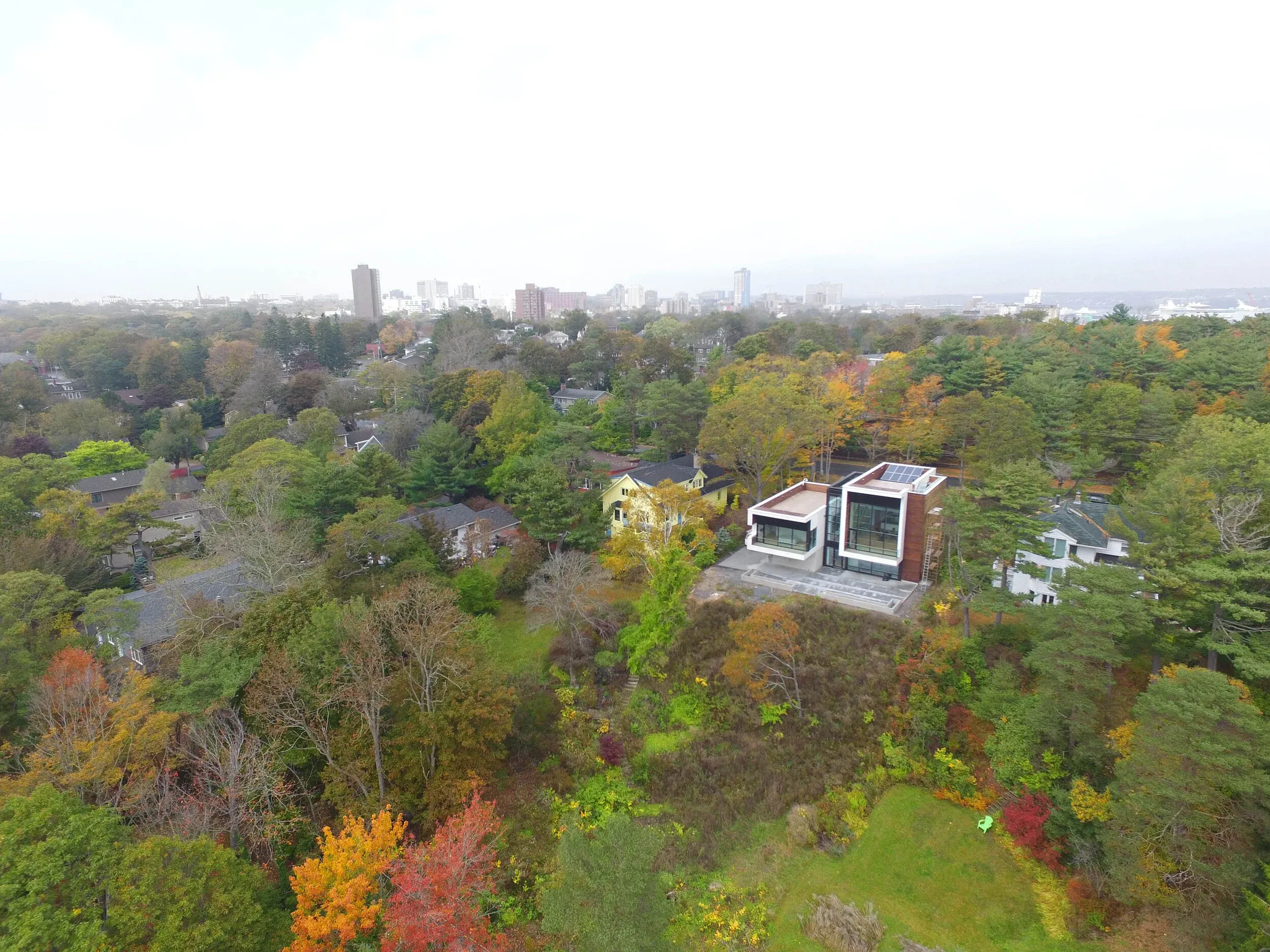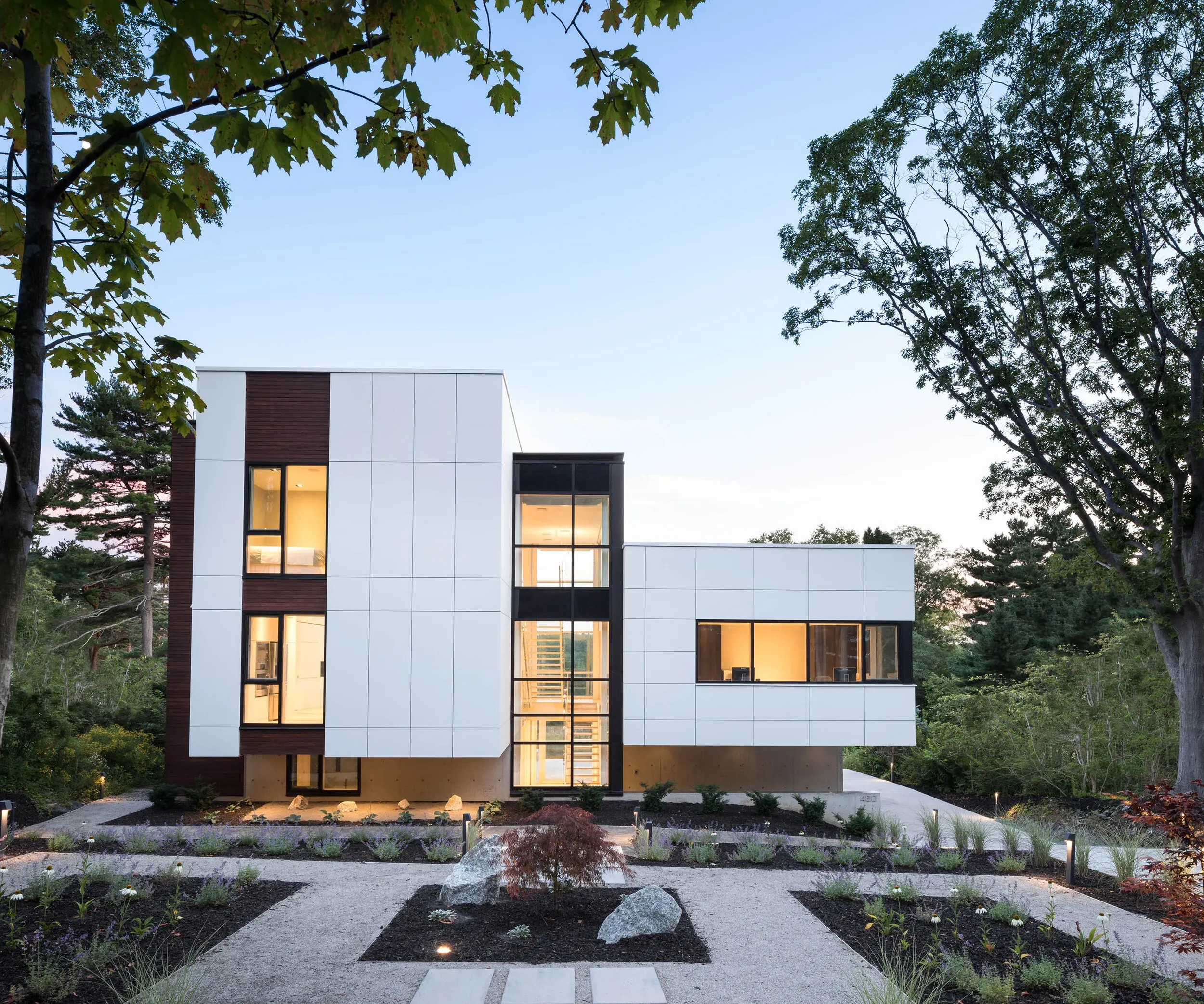 Syncline ˈ(\ˈsin-ˌklīn\): a fold in stratified rock with younger layers closer to the center of the structure. The home sits on the lone syncline that runs through peninsular Halifax. Located in the south end of Halifax, Nova Scotia, Syncline was designed for California-based Geoff and his husband, Nova Scotia-based James – the quiet, masculine modern form sits adjacent to Point Pleasant Park and overlooks the North-West Arm.