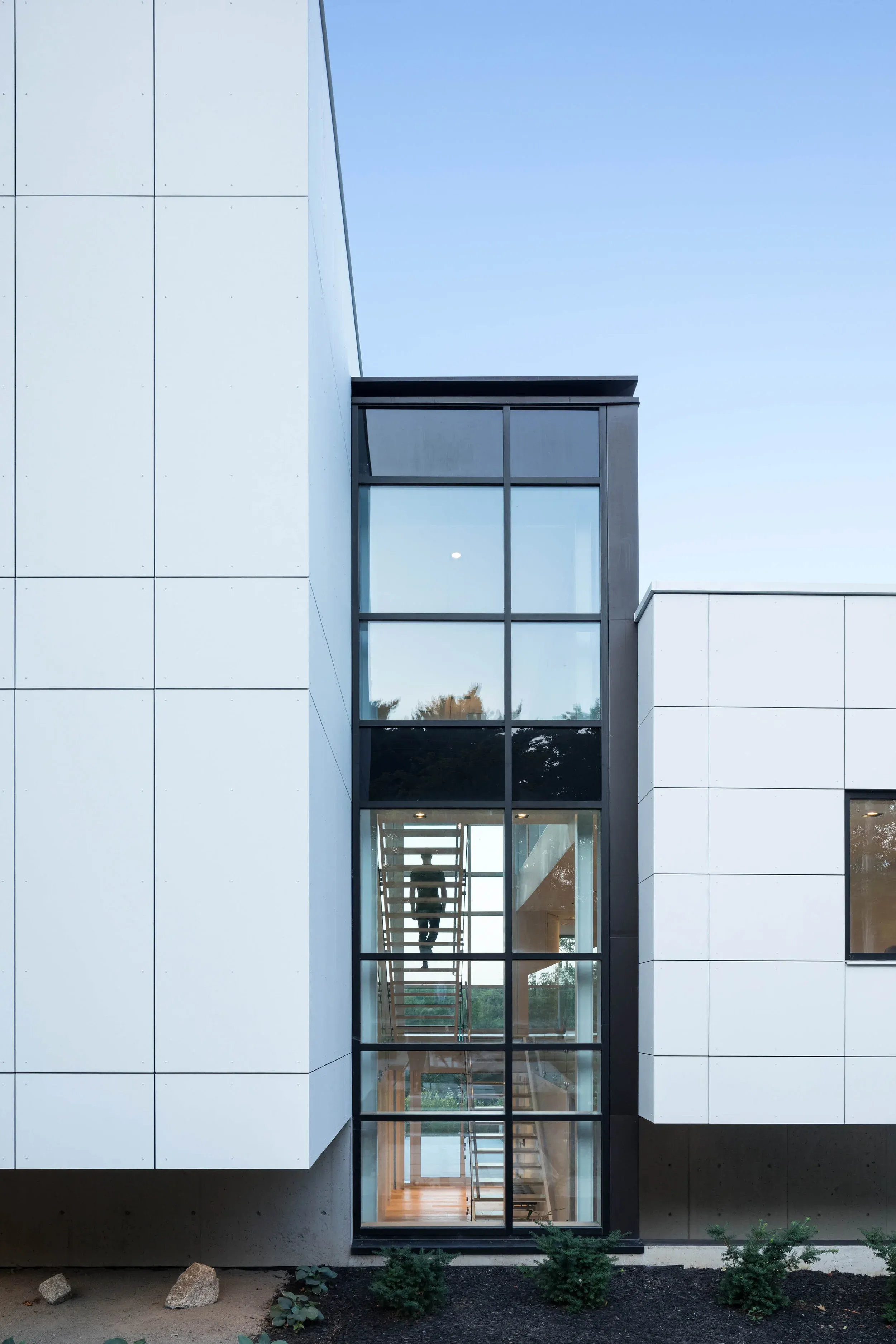 The home utilizes geothermal heat pumps as the primary source for heating and cooling. Energy requirements are supplemented by a rooftop field of photovoltaic panels. The entirety of the glazing utilized for the home is triple pane for both energy conservation and acoustic requirements. Automated blinds and recessed windows on the south west façade help to passively cool the house.
