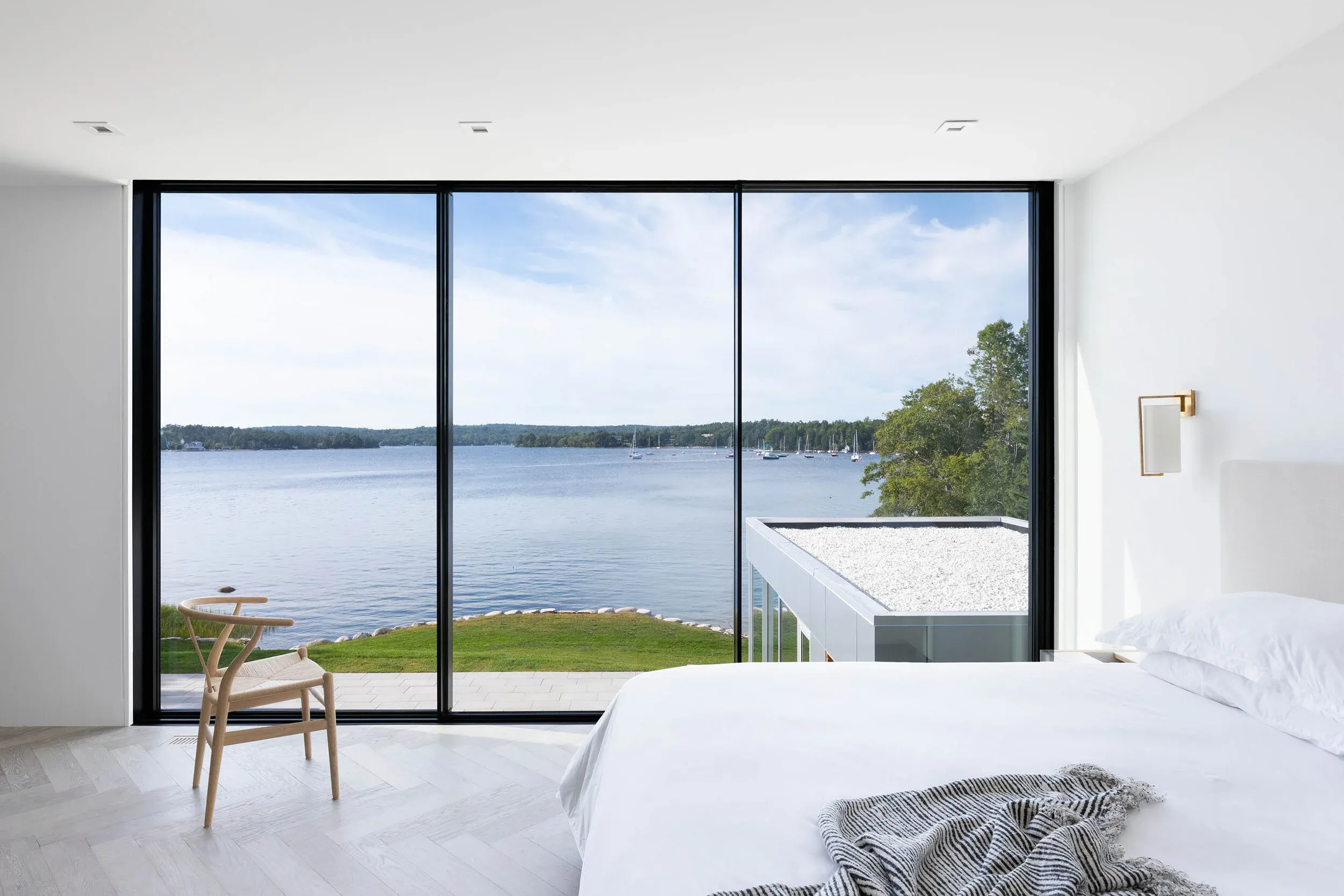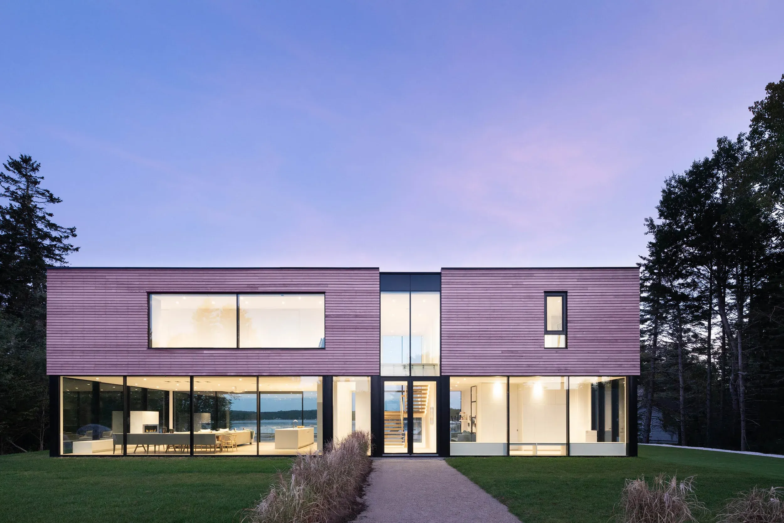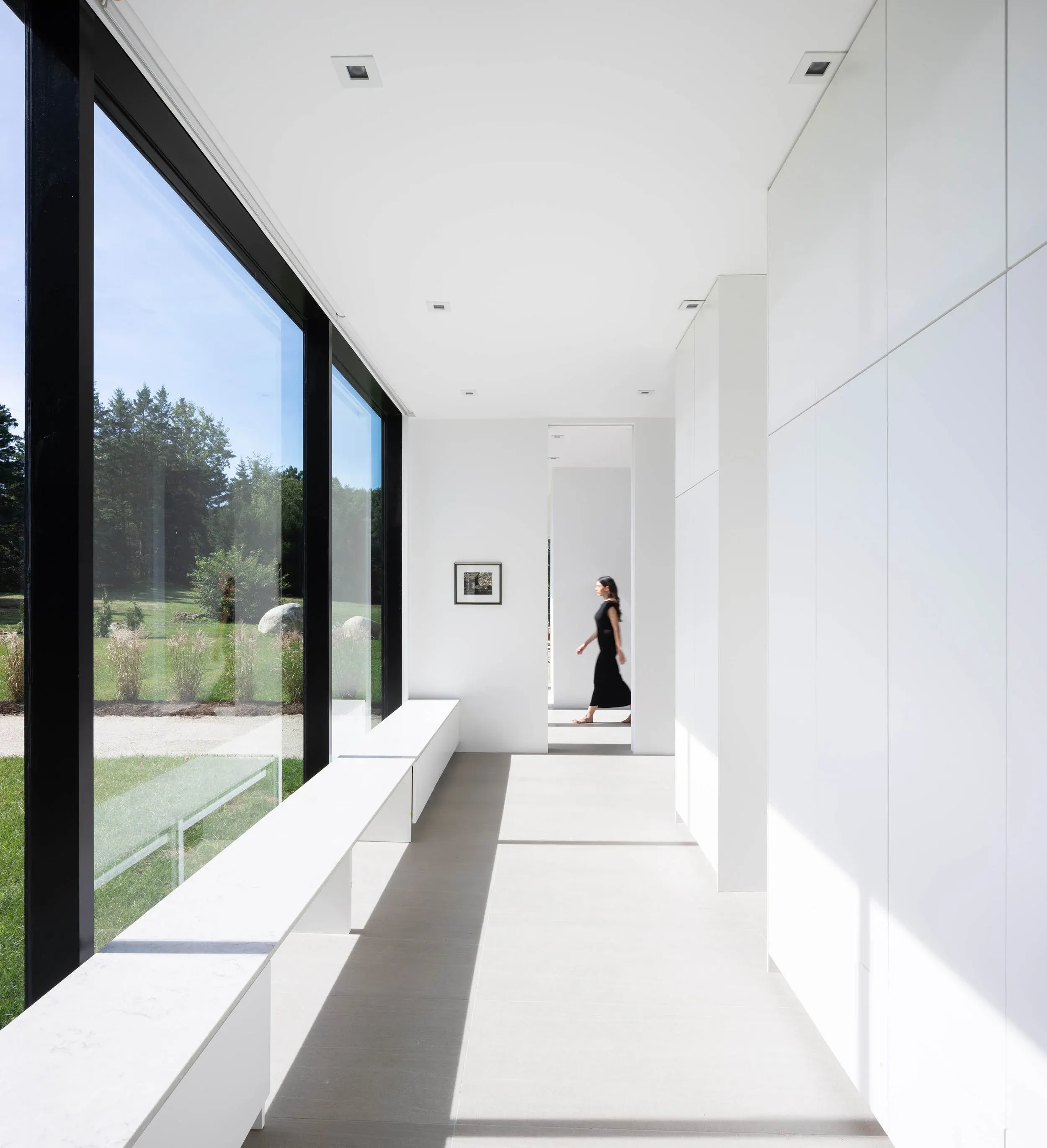 Floating white oak stairs connect the ground floor program with the light-filled upper level through both punched windows and skylights. A massive corridor window stretches nearly 30 feet and provides ample space for reading, relaxing, and taking in the landscape.