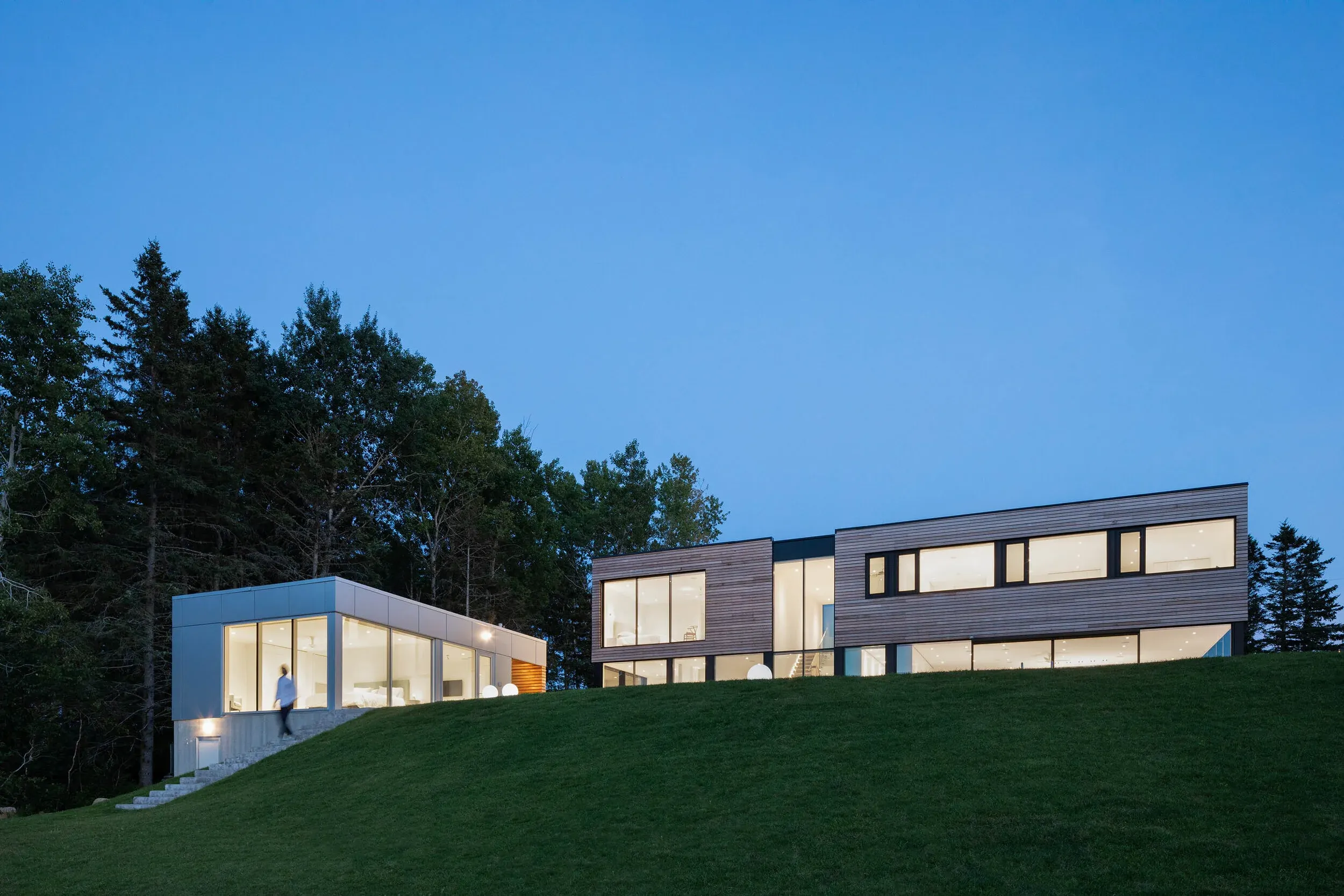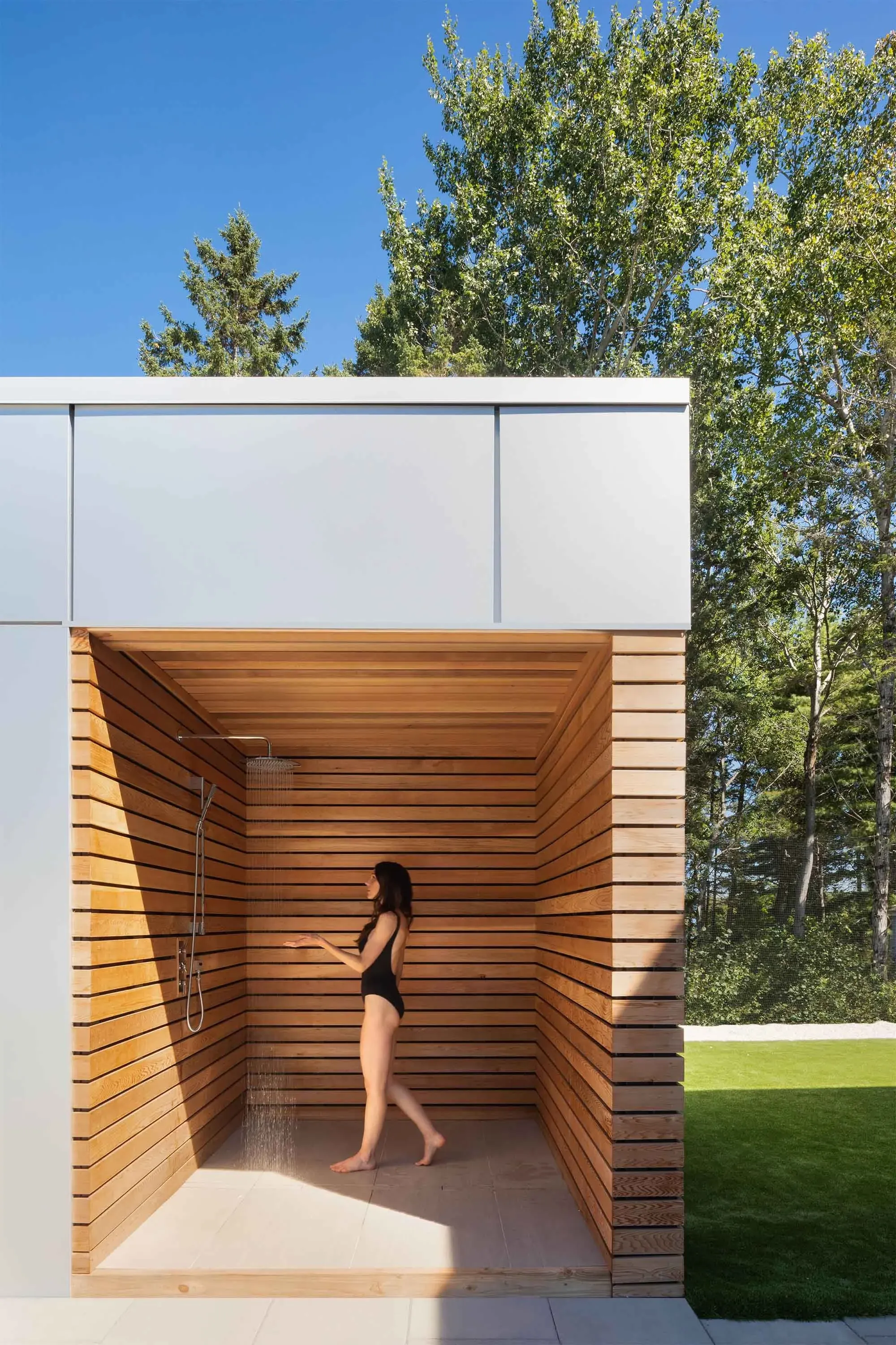 White quartz stone tops both accessory buildings which are stitched in plan by a linear sports area designed to accommodate a zipline and various activities enjoyed by the family.