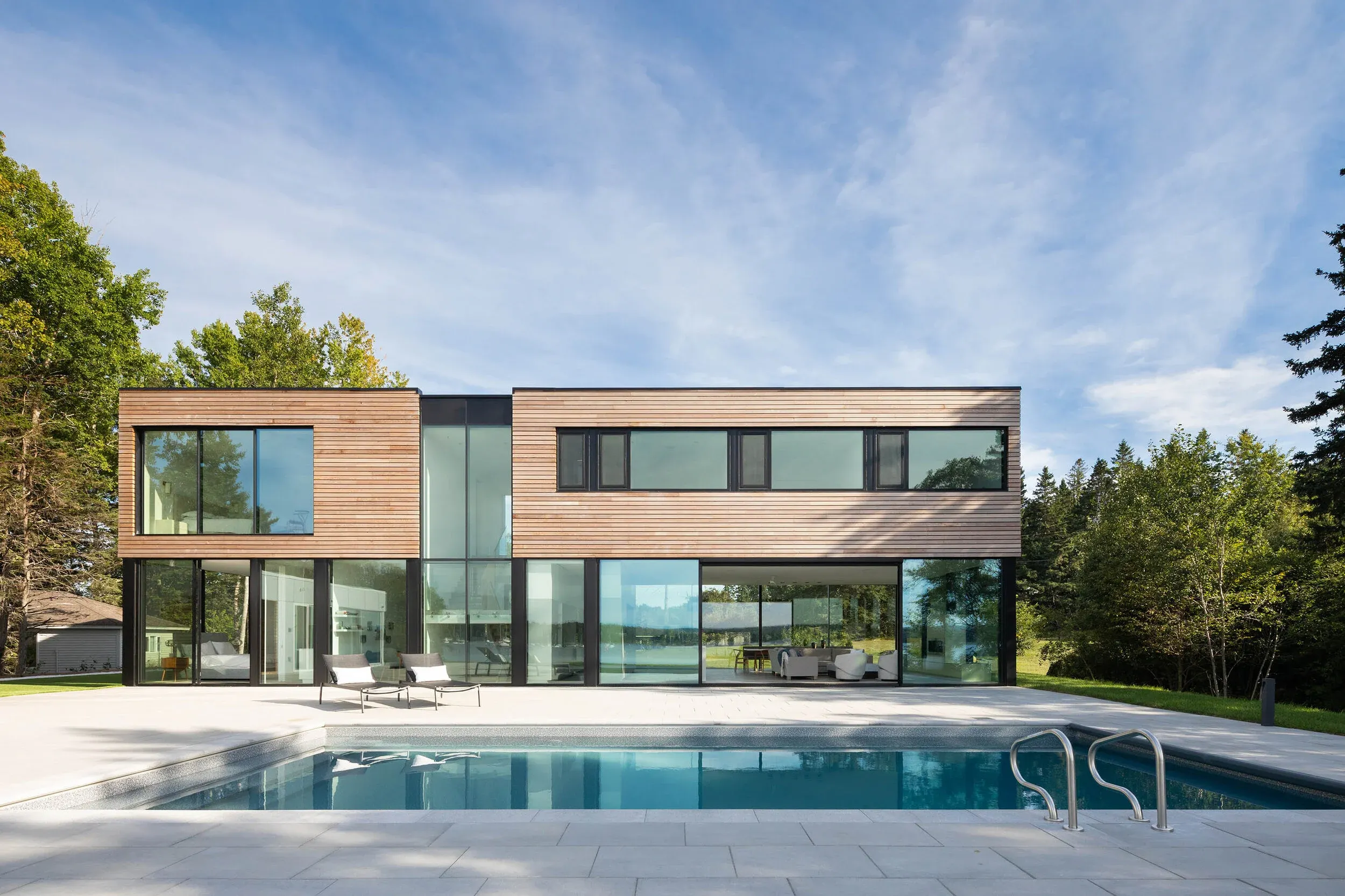 Formally composed of 3 rectilinear volumes on a plateau overlooking the ocean, the home is designed for optimal interaction with the outdoors. The main house is a stacked box clad in red cedar-clad horizontal boards hovering above a glass-encased ground level. Massive sliding glass panels allow the heart of the home, the kitchen and living room, to open up to the swimming pool and deck. Adjacent to the pool, at a right angle to the main house, is a pool house which accommodates private guest living quarters. The pool and main house make for an enclosed court on the private side of the house while an aluminum panel-clad garage forms the entry court on the public side of the house.
