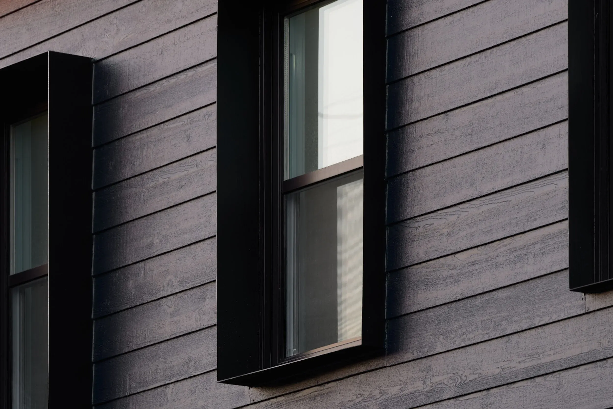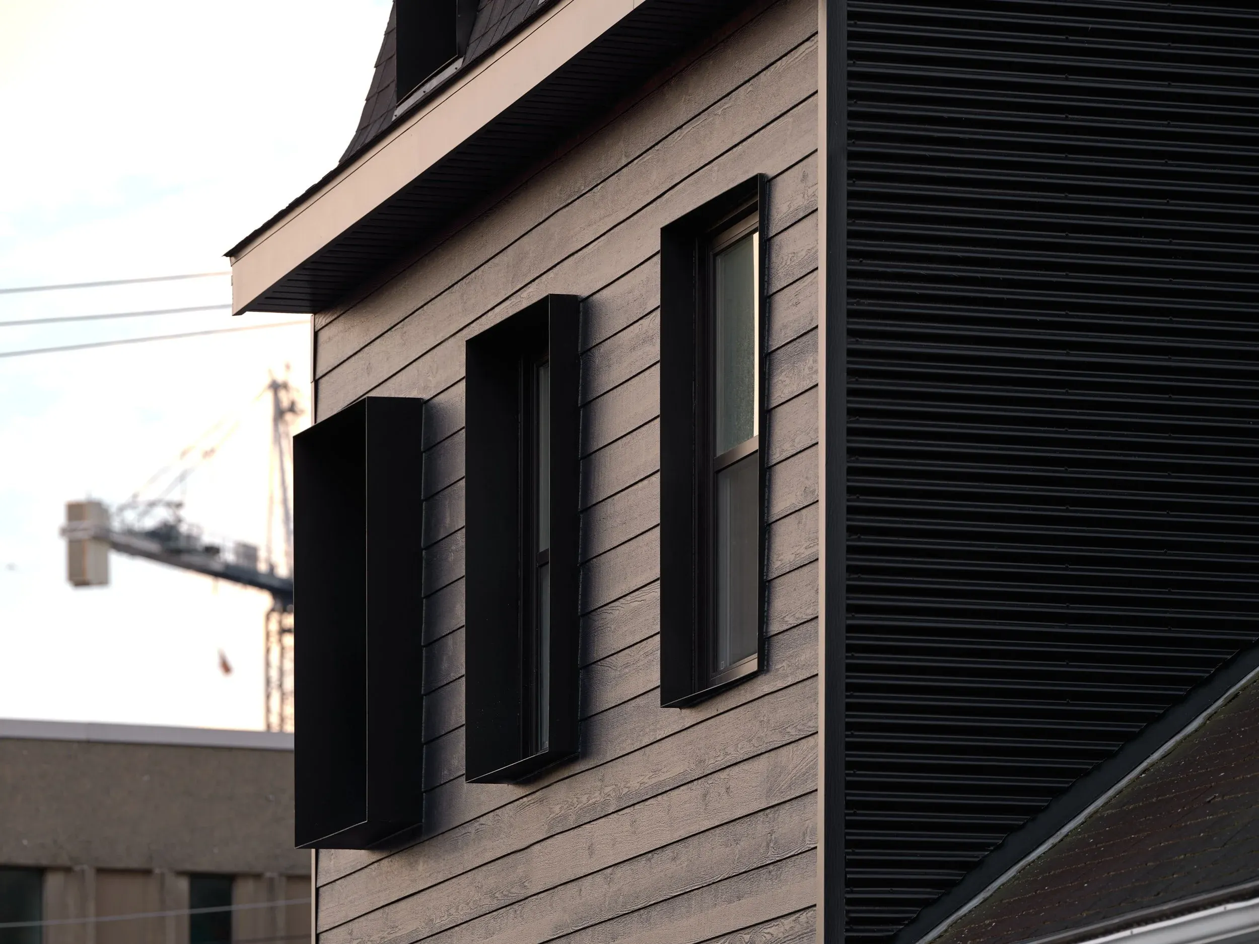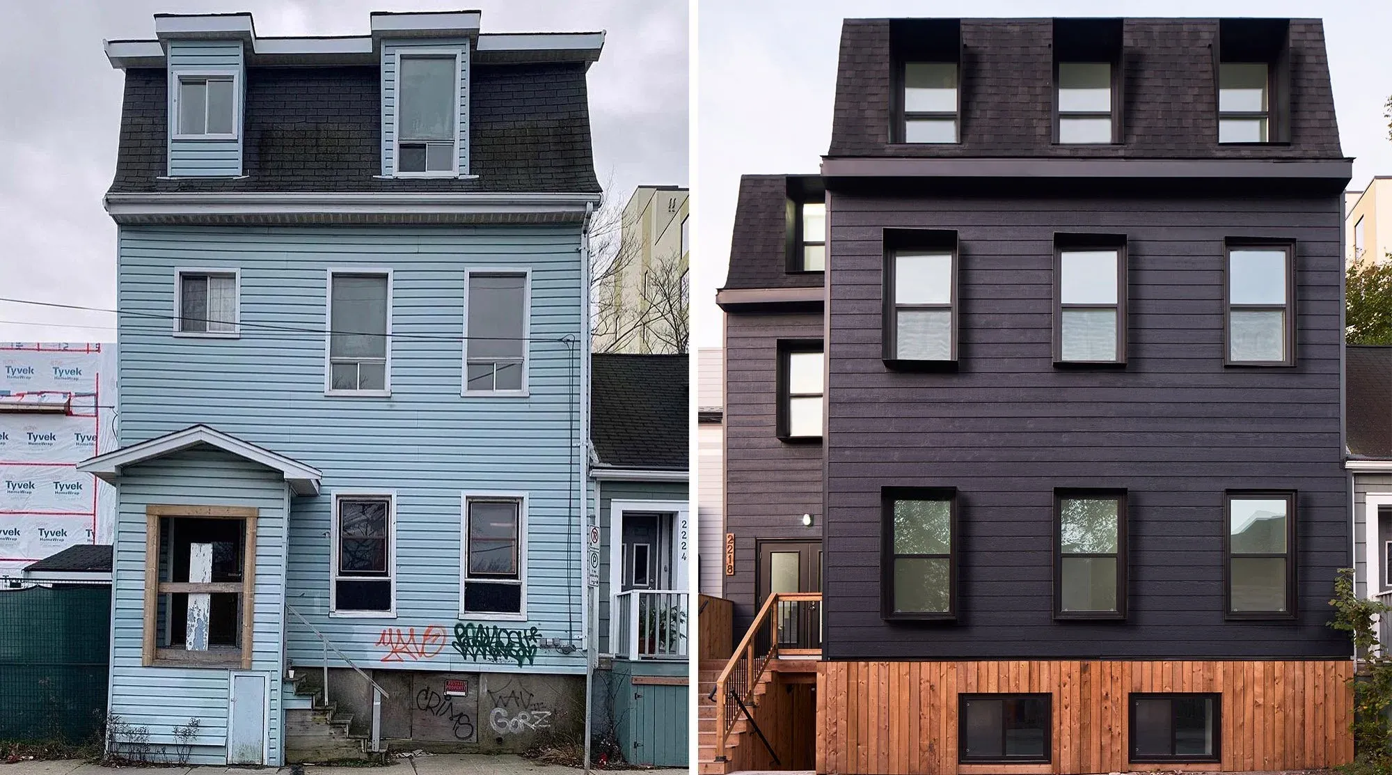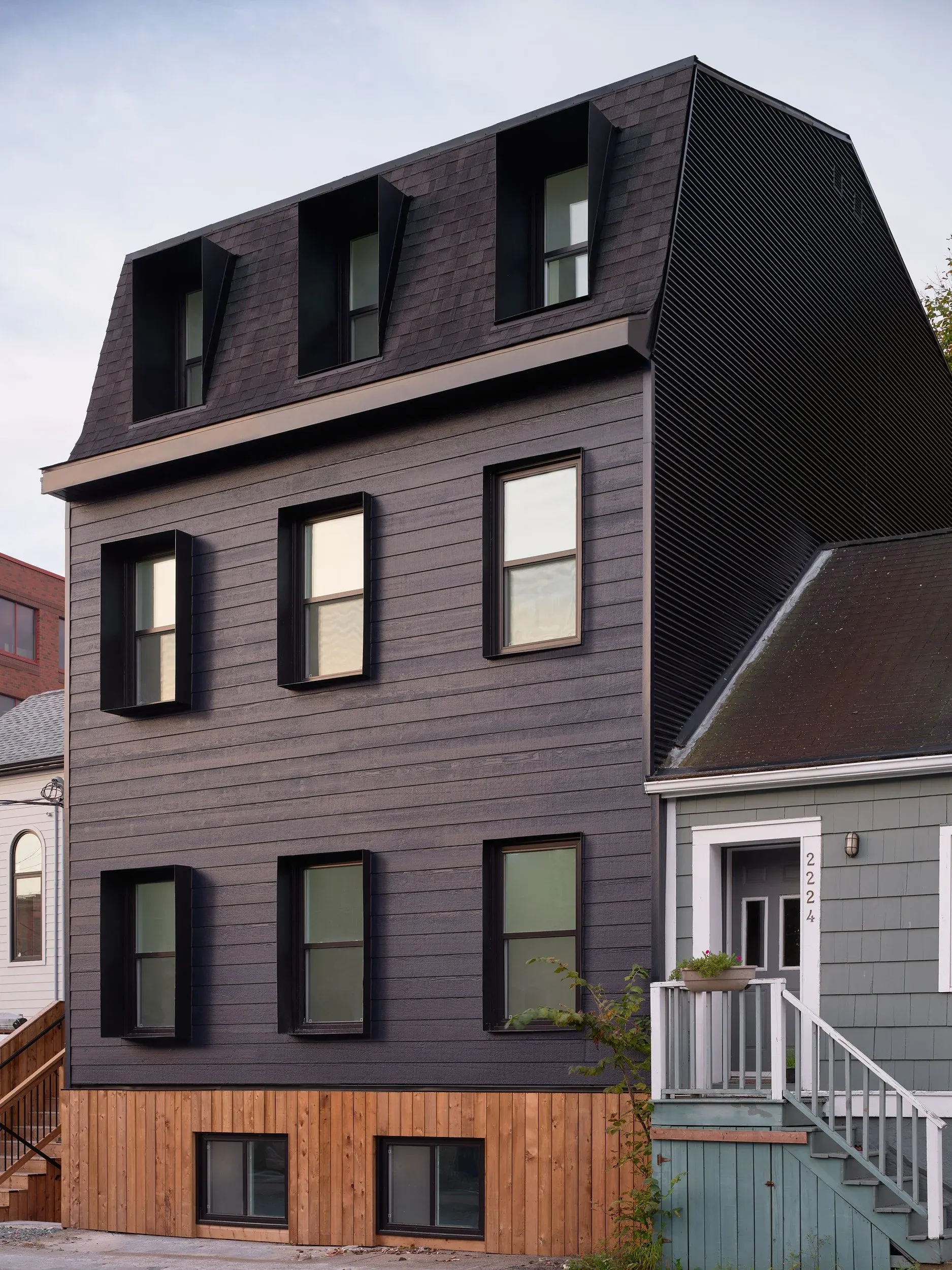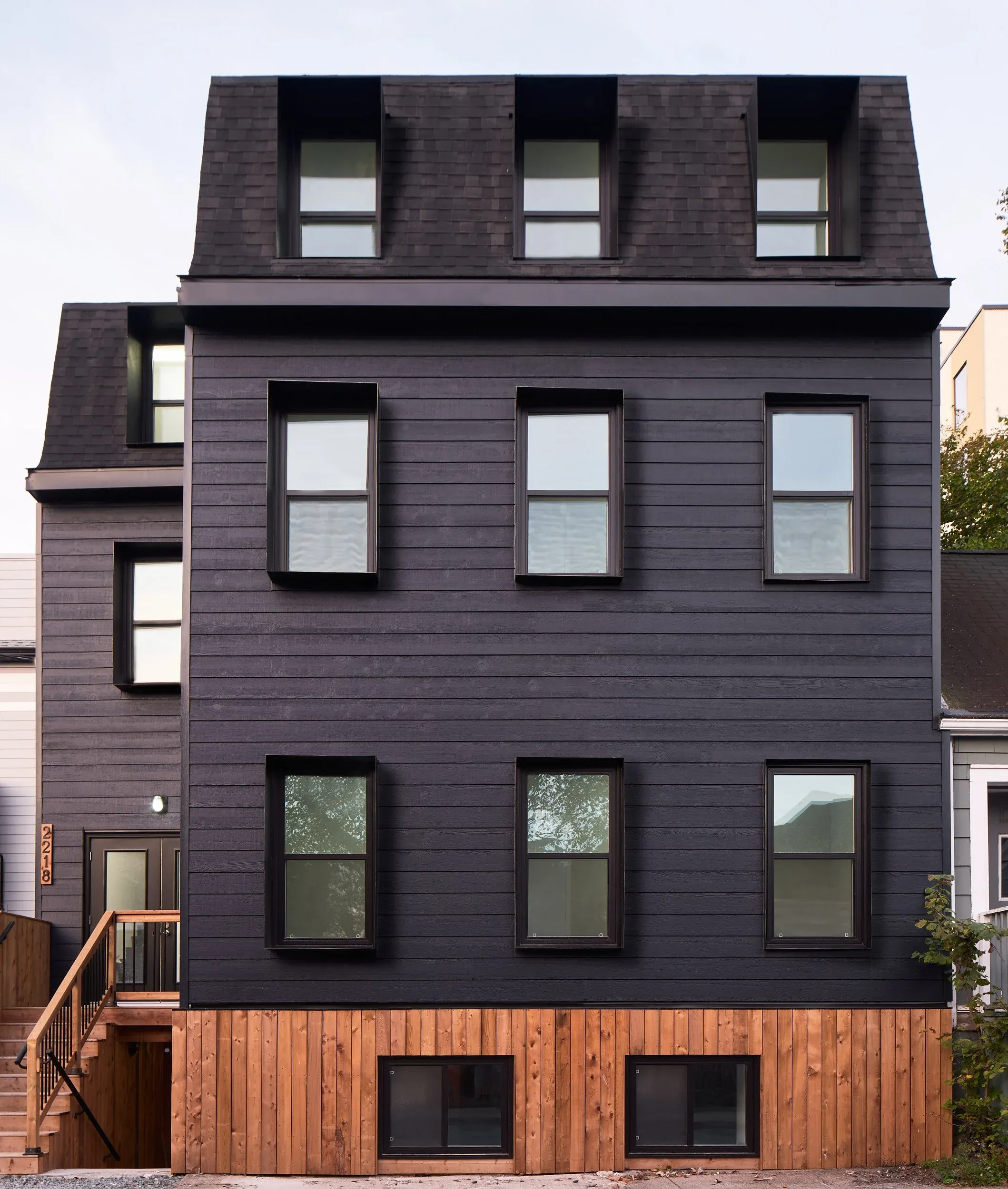 The design reintroduces symmetry to the building façade which, over the years, had become a mismatched patchwork of windows and entries. New large windows provide plenty of natural light and ventilation. The deteriorating vinyl siding was replaced with deep navy-blue wood siding, a nod to the wood textures and traditional colourful houses in the neighbourhood. The existing dormers were replaced with a modern take on the traditional form: clean-lined metal shrouds. This language was translated to metal window surrounds below which are angled to follow the property line, giving a subtle gestural quality to the building facade. On the upper levels, the dormers frame calming views of the Halifax Harbour and Saint George’s Round Church. Through thoughtful interventions, the existing house transformed into a dignified building, helping to restore the character of the streetscape and respecting the individuals that will call it home.