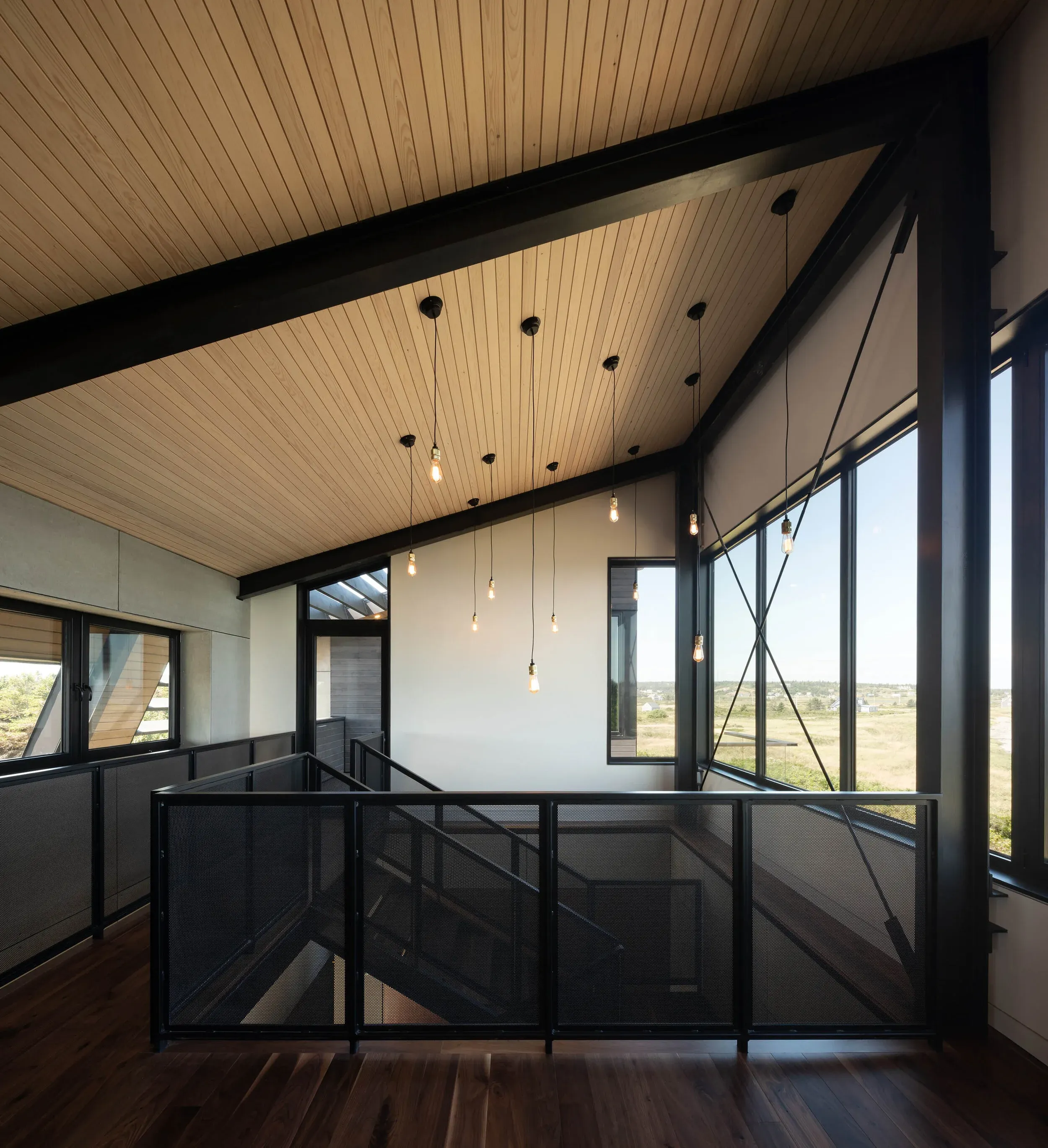 The lower level includes a garage and guest wing both flanking the internal breezeway and a steel staircase clad in walnut and black steel. On the second floor, the living space is surprisingly rich and warm with hints of colour, brass fixtures and a warm palette of light and dark wood tones. Centred in the room is a linear fireplace. An outdoor space protects both privacy and the intense summer sun with a wood brise soleil. The deck cantilevers out from the house, projecting towards the beach and peripheral views.