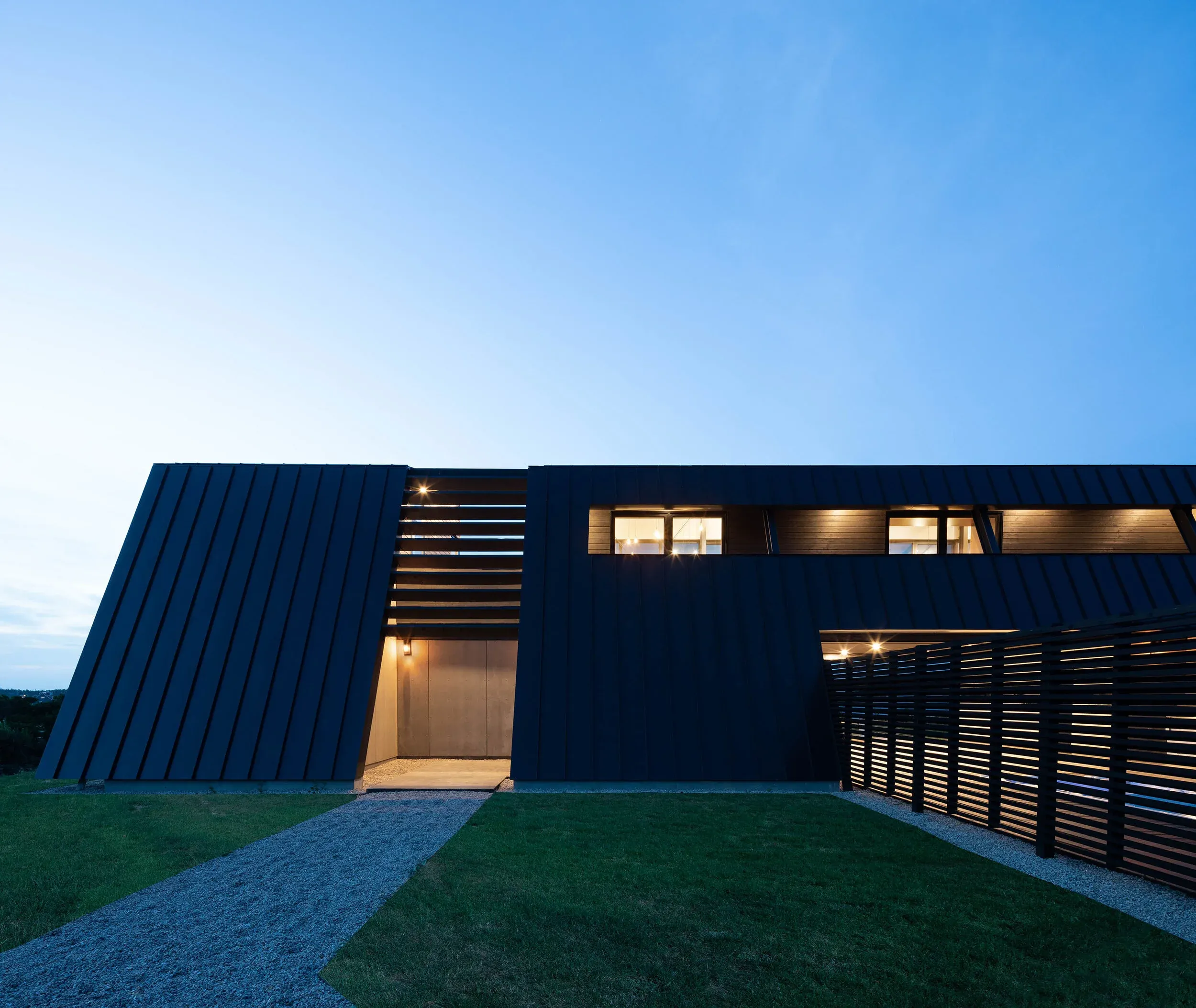 Located adjacent to the wild landscape of Kingsburg Beach on the south shore of Nova Scotia, set amongst tall grasses, roaming deer and the raw scent of the sea. The dark silhouette of the fortress-like structure, one of few things seen through the thick fog. Leaning forward with a canted back shell inspired by local gambrel-rooved barns, the residence braces itself for the unpredictable Nova Scotian weather.