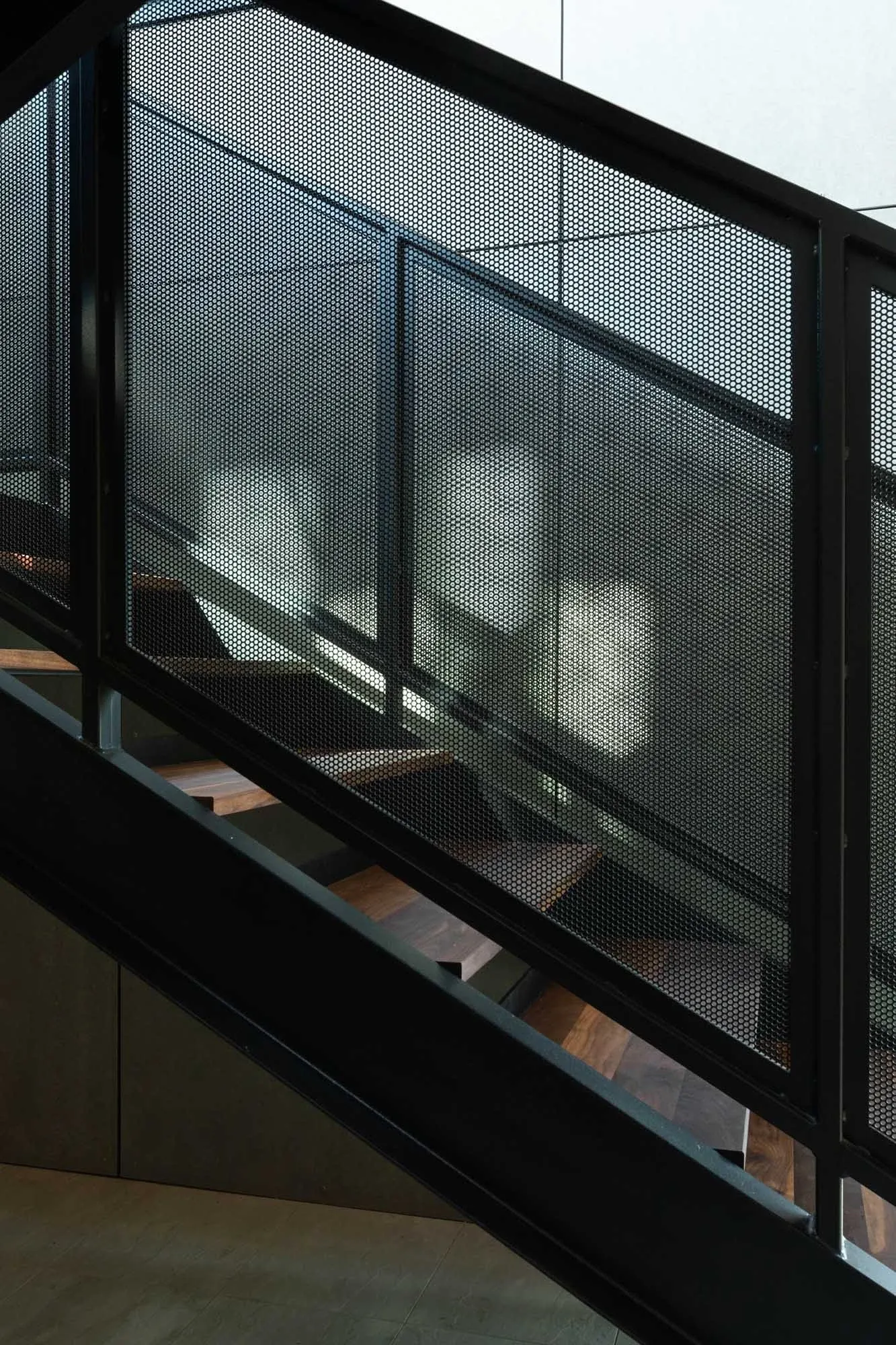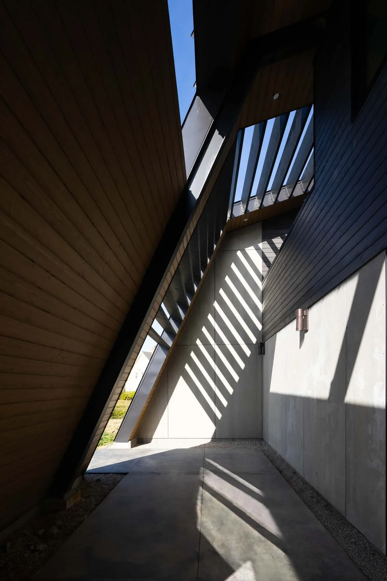 Heavy, black steel frames repeat from end to end of the structure providing the armature for its dynamic form. The heavy, dark shell is clad in extra-dark bronze, aluminum standing seam.